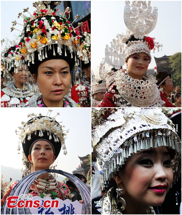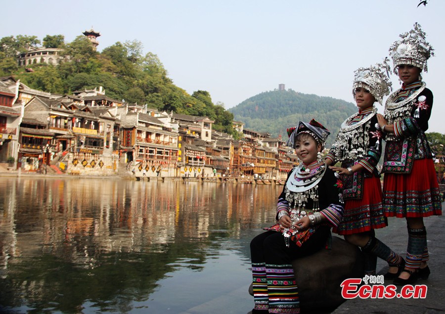 A total of 17 teams from Hunan, Guangxi, Yunnan and Guizhou participate in a show featuring Miao ethnic minority costumes at Fenghuang Ancient Town in central China's Hunan province on October 13, 2013. [Photo: China News Service / Tang Xiaoqing]