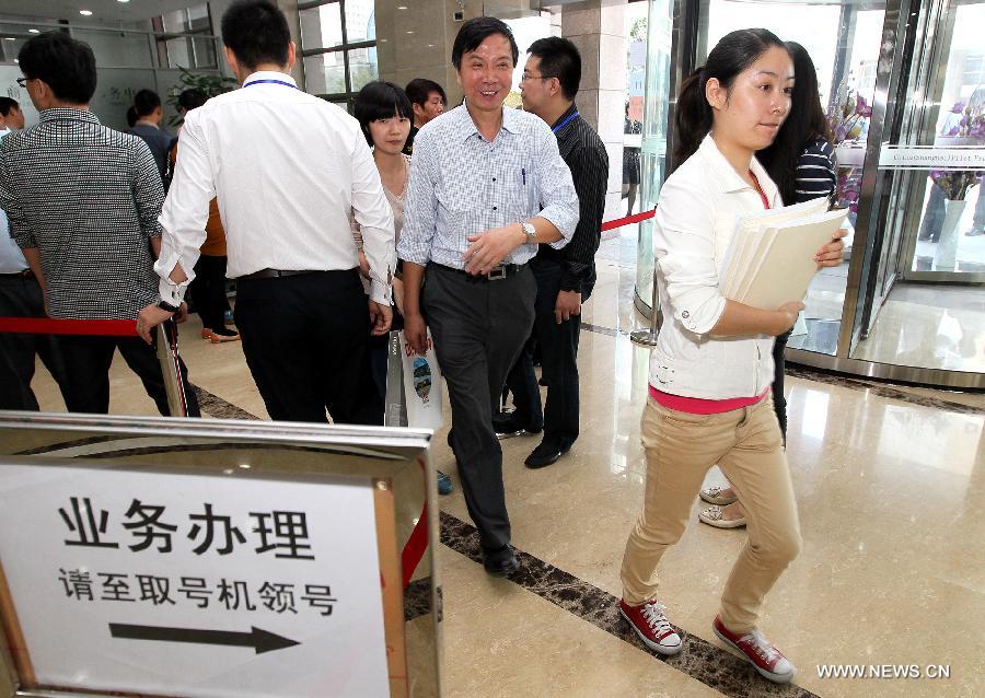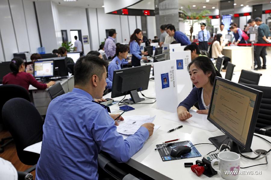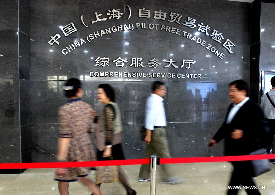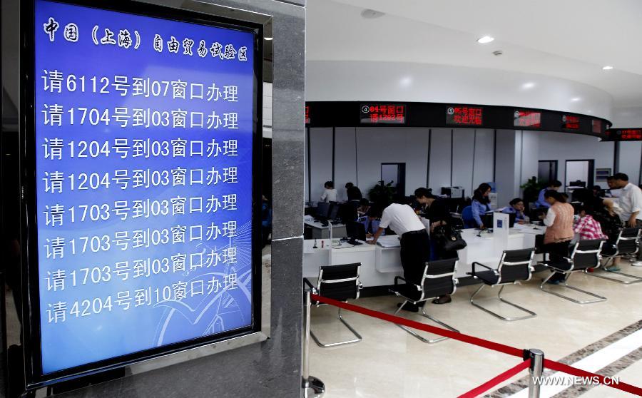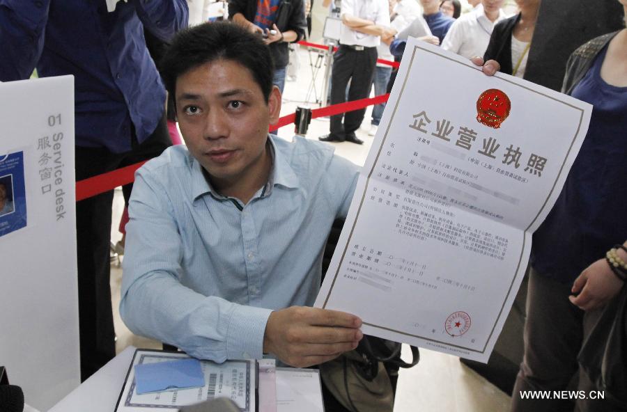 An enterprise representative shows the business registration he just received at the service lobby of Shanghai Free Trade Zone (FTZ) in Shanghai, east China, Oct. 14, 2013. The newly-launched Shanghai pilot free trade zone (FTZ) started offering enterprise registration service recently. (Xinhua/Xu Wanglin)