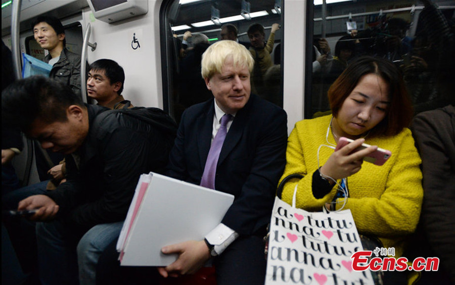 London Mayor Boris Johnson is seen on a subway train in Beijing on October 15, 2013. He took subway on Tuesday to experience its service and understand its transportation system in the capital city. [Photo/CFP]