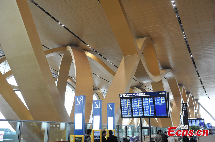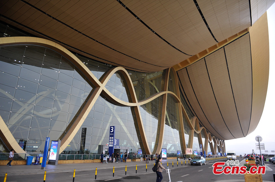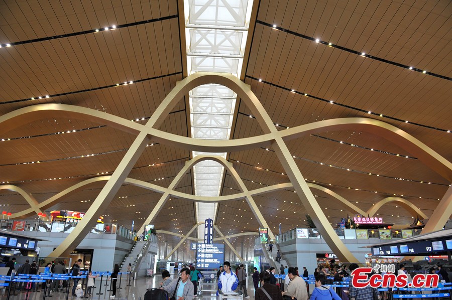 Photo taken on October 16, 2013 shows golden interior of Kunming Changshui International Airport in Kunming, capital city of southwest China's Yunnan province. The airport is listed as one of China's top ten buildings covered with "local tyrant gold" by Chinese netizens. "Local tyrant gold", is derived from the term "local tyrant", and has become a popular phrase in China. It is used to describe the gold iPhone 5S. Apple calls the color "champagne gold," but many Chinese netizens have adopted the more satirical and critical description "local tyrant gold" to refer to rich showoffs. [Photo: China News Service / Liu Ranyang]