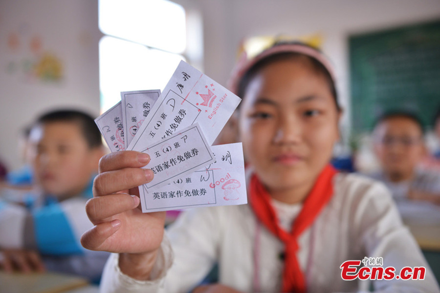 A girl student shows her "homework-free" coupons at Zhenjiang New District Experimental Primary School in east China's Jiangsu province on October 16, 2013. [Photo/IC]