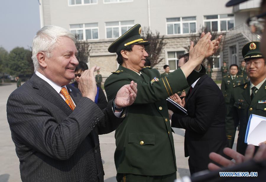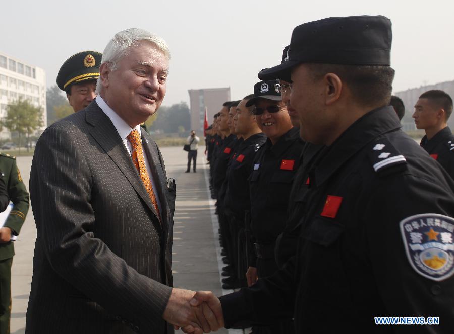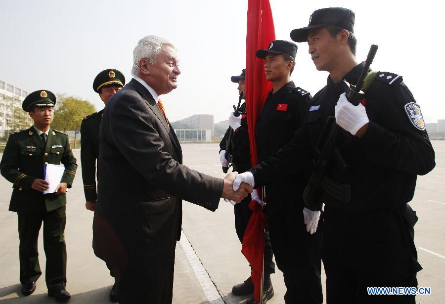 Herve Ladsous (C), UN Under-Secretary-General for Peacekeeping Operations, shakes hands with a member of a Chinese riot police team at a training center for Chinese peacekeeping police in Langfang, north China's Hebei Province, Oct. 17, 2013. The riot police team will leave for Liberia on Oct. 21 to conduct peacekeeping missions there. (Xinhua/Wang Shen)