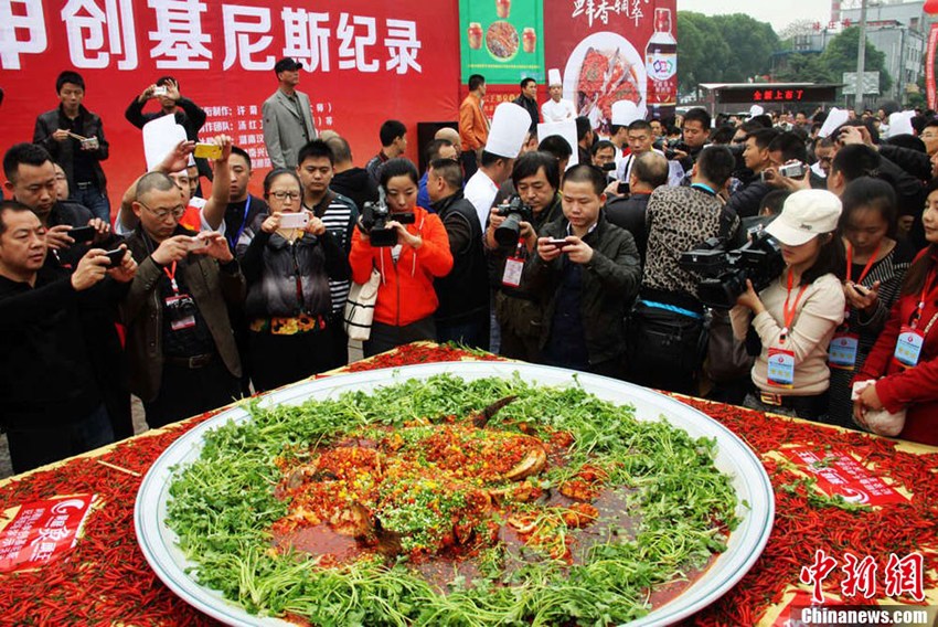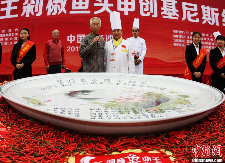 People take photo of a giant dish of "steamed fish head with diced hot peppers" in Changsha, capital of central China's Hunan province, Oct. 19, 2013. The famous dish of Hunan cuisine, cooked and presented to visitors at the opening ceremony of the 23rd Chinese Chef Festival, was set to bid for Guinness World Records. The festival kicked off in Changsha on Saturday. (Photo:China News Service/Tang Xiaoqing)