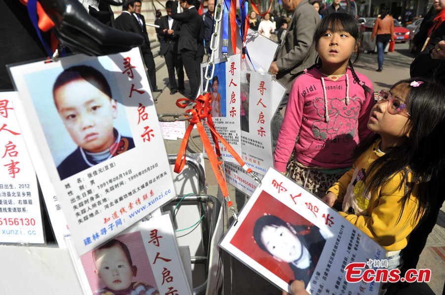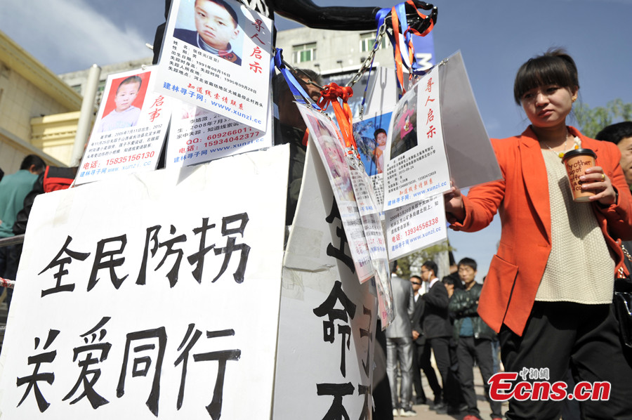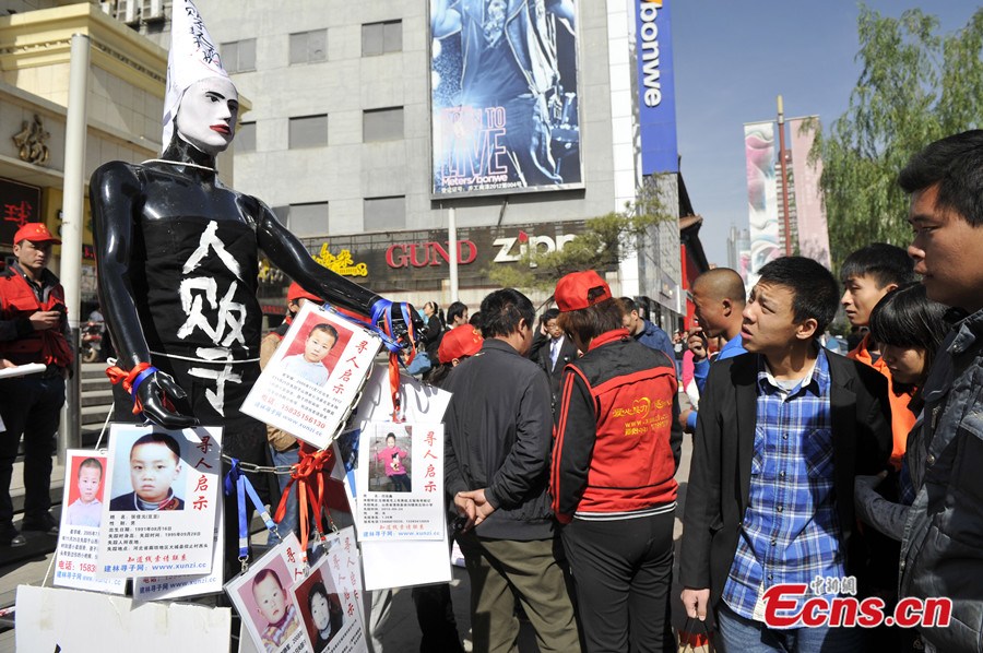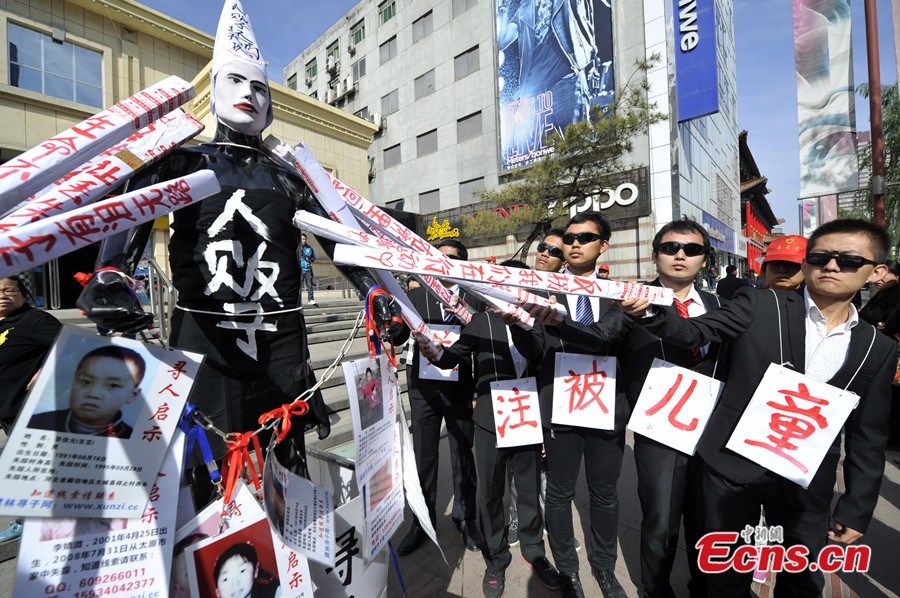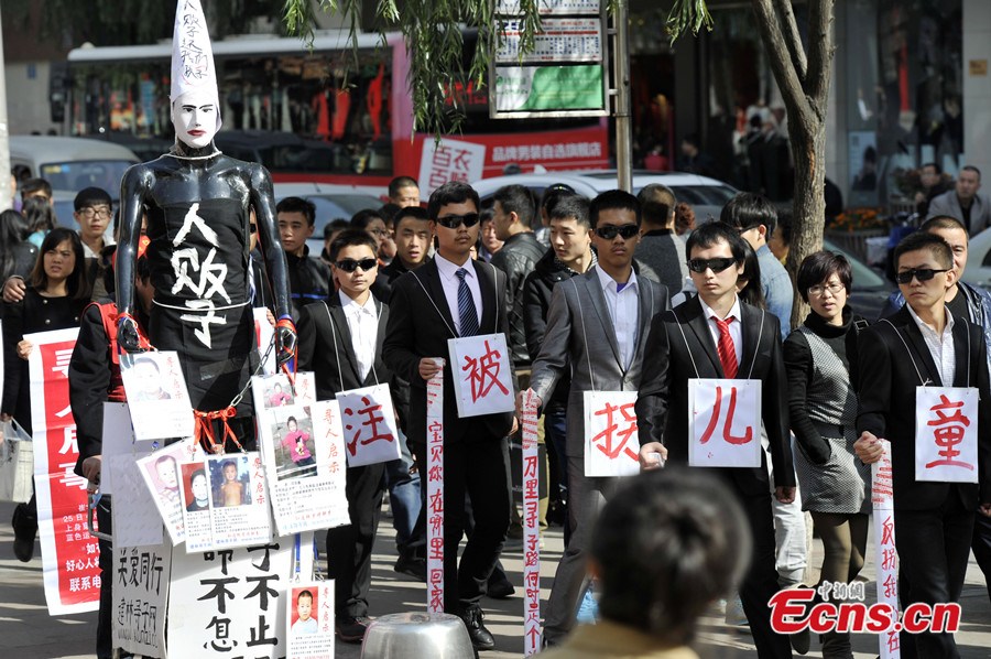 College students call for greater anti-trafficking awareness and harsher crackdown on child trafficking through street art performance in Taiyuan, capital city of north China's Shanxi province on October 20, 2013. [Photo: China News Service / Wei Liang]