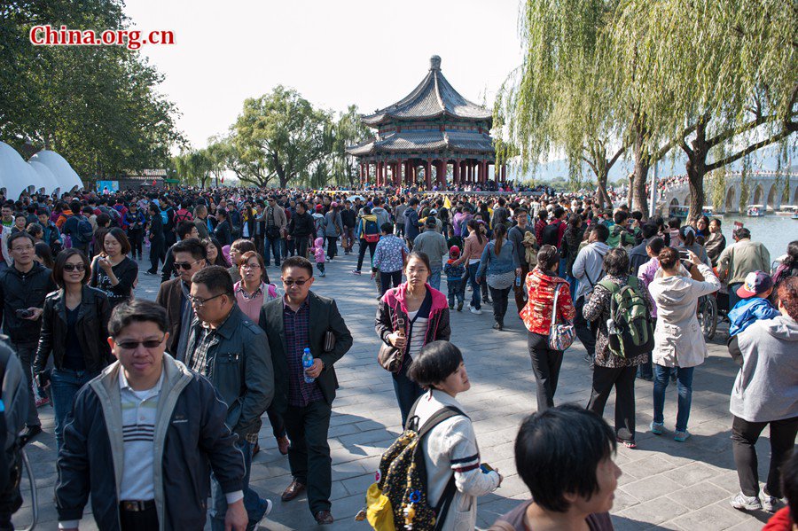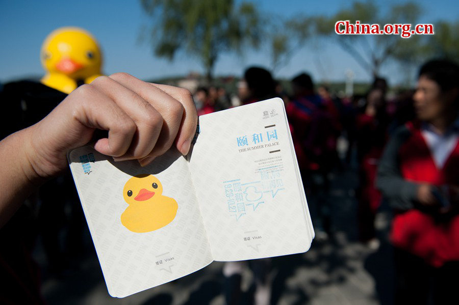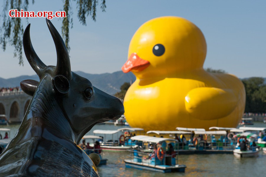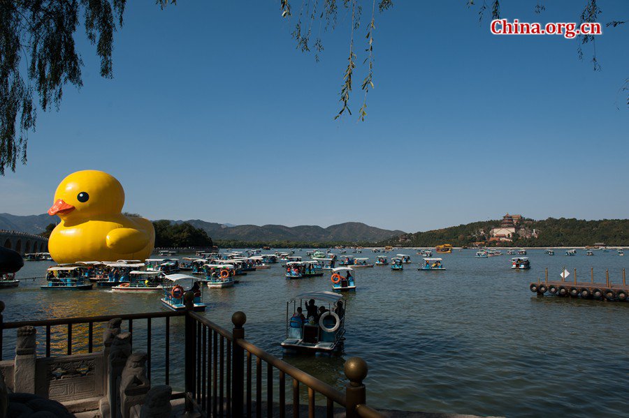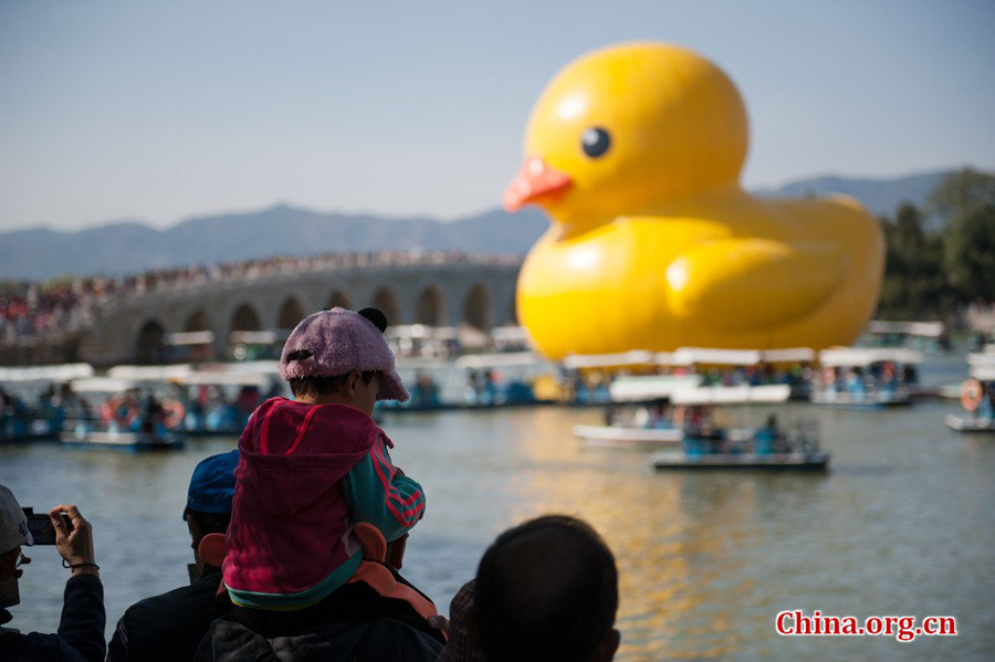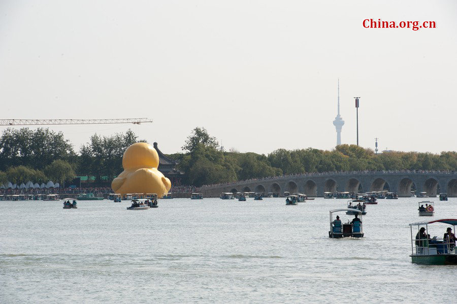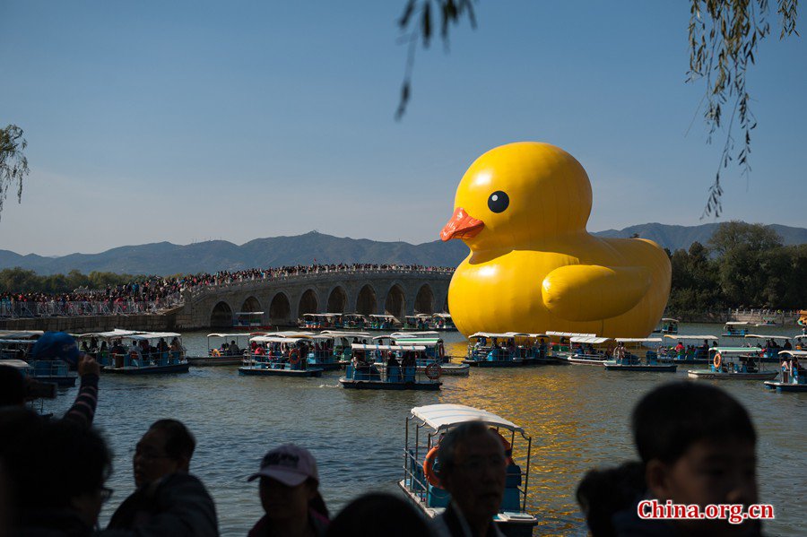 Some 40,000 visitors rush into the Summer Palace in Beijing on Sunday, the last weekend day before the iconic Giant Rubber Duck will leave Beijing on October 26.(Photo: China.org.cn)