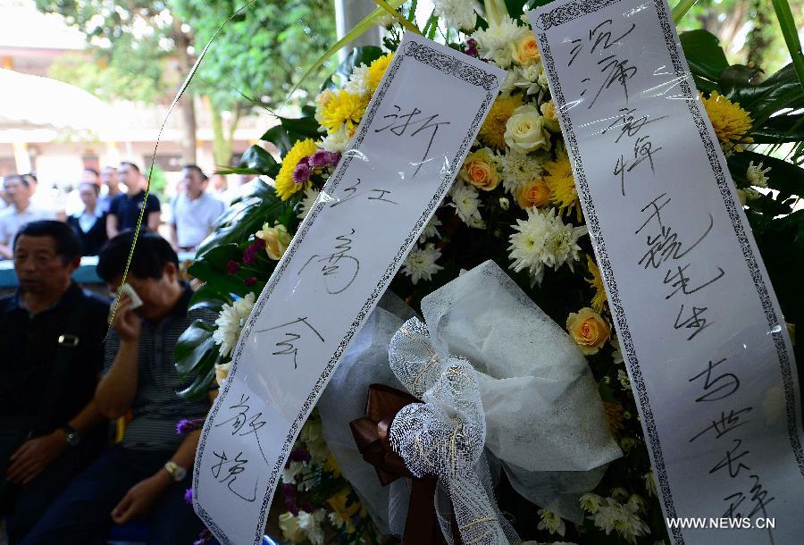 Wreaths are seen on the memorial of the Chinese victim Gan Rui in Vientiane, Laos, Oct. 22, 2013. The Lao Airlines' Flight QV301 from Vientiane, carrying 44 passengers and five crew members, crashed into the Mekong at Done Kho Island last Wednesday. Gan Rui, the victim from China's Yunnan province and also vice chairman of the Chinese Chamber of Commerce in Laos, has been identified by family last Friday. (Xinhua/Liu Ailun)