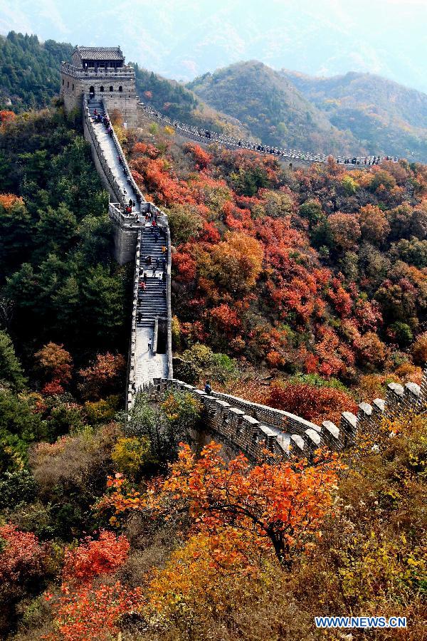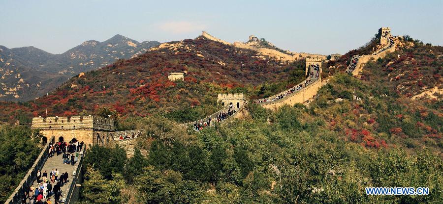 Photo taken on Oct. 21, 2013 shows the scenery of red autumnal leaves at the Great Wall at Badaling, Beijing, capital of China. (Xinhua)