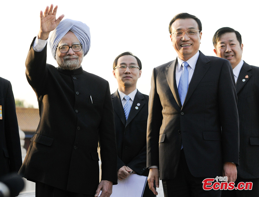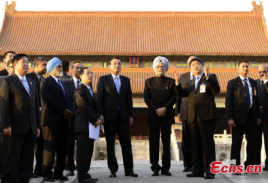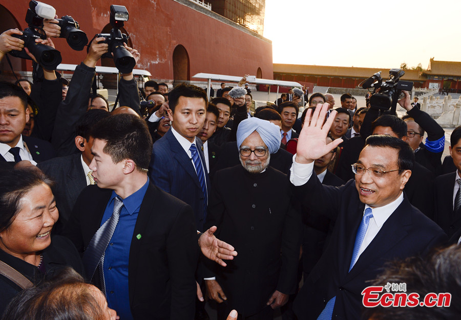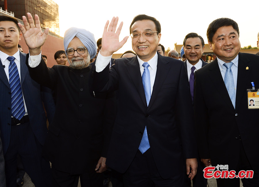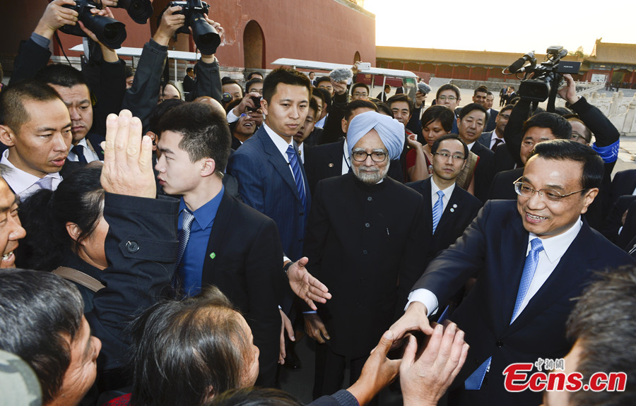 Premier Li Keqiang and Indian Prime Minister Manmohan Singh shake hands in the Forbidden City in Beijing on Oct. 23, 2013. Hosted by Premier Li, Singh toured the Forbidden City on Wednesday, the day China and India signed agreements in fields including border cooperation and the economy. [Photo: China News Service/ Liu Zhen]