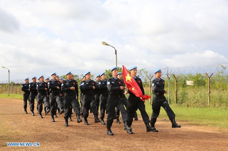 Members of Chinese peacekeeping police hold the national flag of China during a flag-raising ceremony in Liberia, Oct. 24, 2013. The first patch of Chinese riot police team arrived in Liberia on Oct. 23, to conduct peacekeeping missions here. (Xinhua/Gao Xuede)