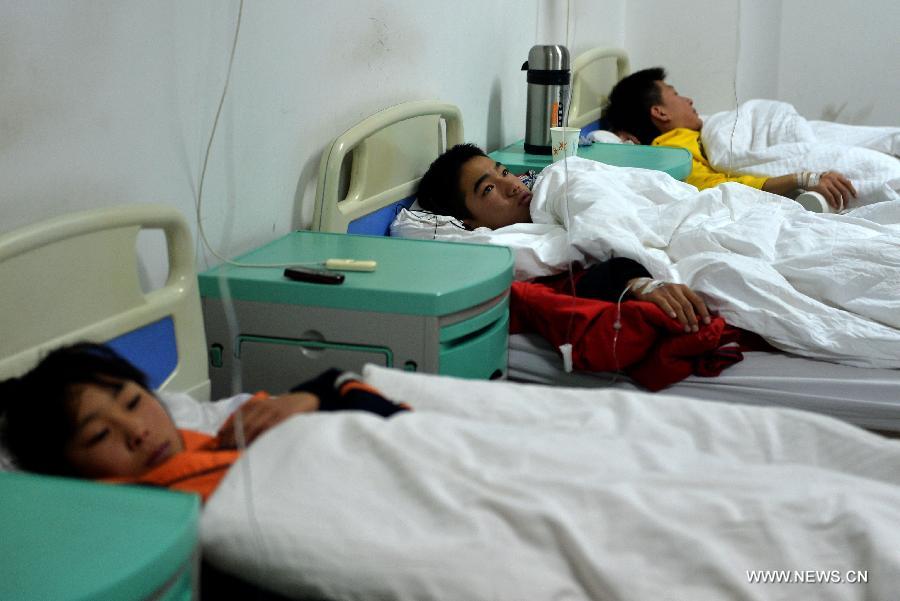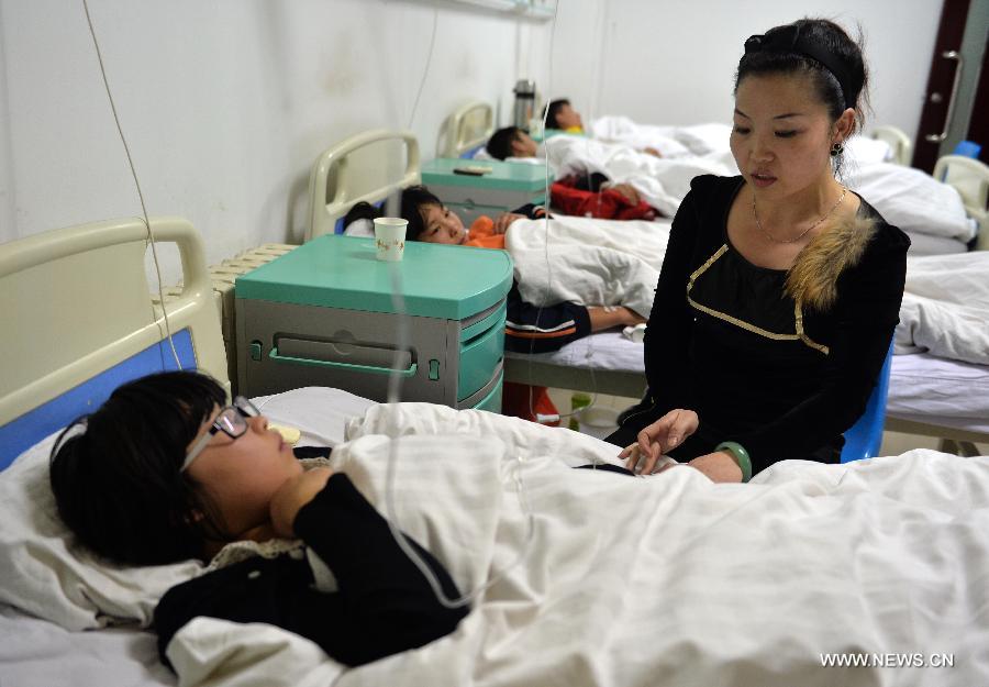 Medical workers ask Di Jiaqi (L), a second year student from the local Hui People Middle School, about his physical condition in a hospital in Baotou, north China's Inner Mongolia Autonomous Region, Oct. 24, 2013. A suspected food poisoning case on Thursday made over 280 students ill at the school in Baotou. Students complained of stomachache and vomiting around 3:30 p.m. after lunch in the school dining hall. Right now 253 students and two teachers remained in hospital under observation. (Xinhua/Ren Junchuan)