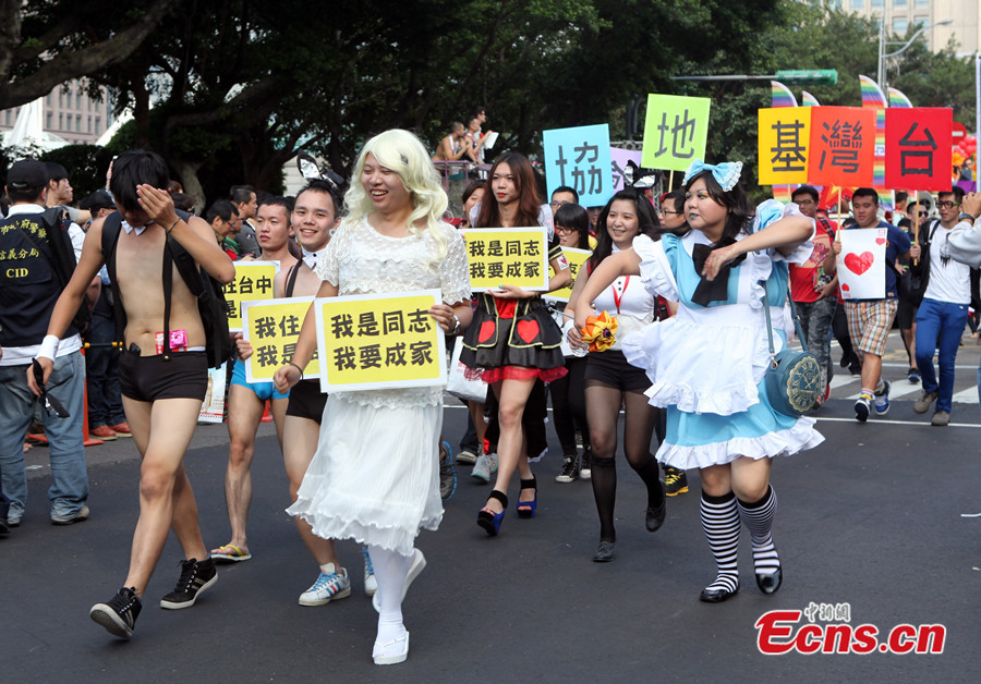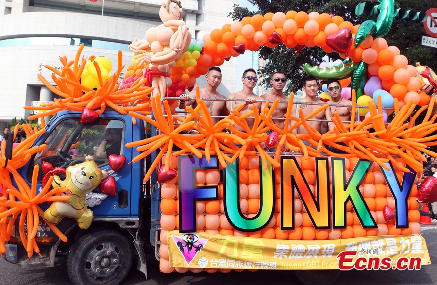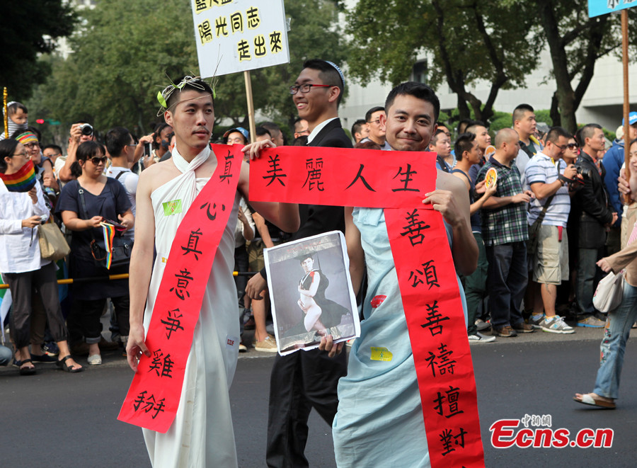 Tens of thousands of gay right supporters take to the streets in Taipei for the LGBT Pride Parade, calling on the public to give support to lesbian, gay, bisexual and transgender (LGBT) people, on October 26, 2013. [Photo/Chen Liyu]