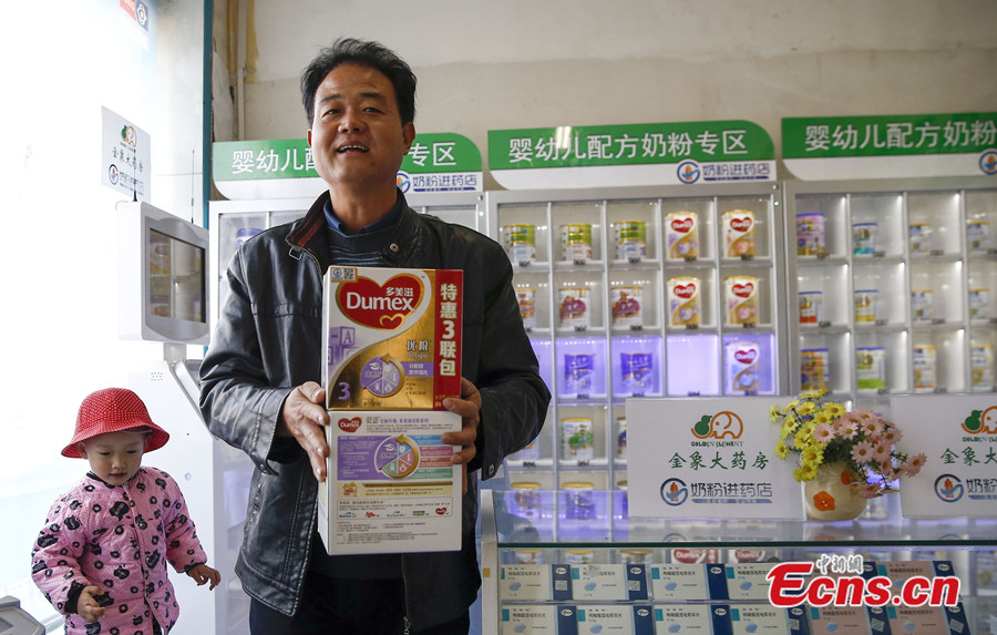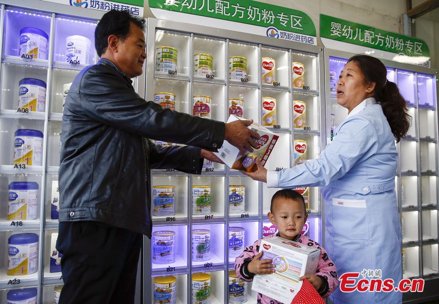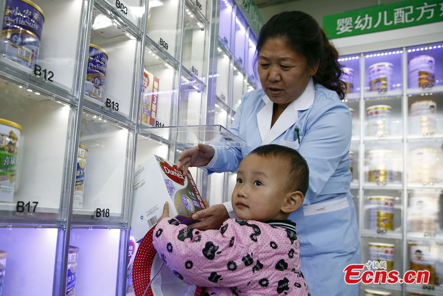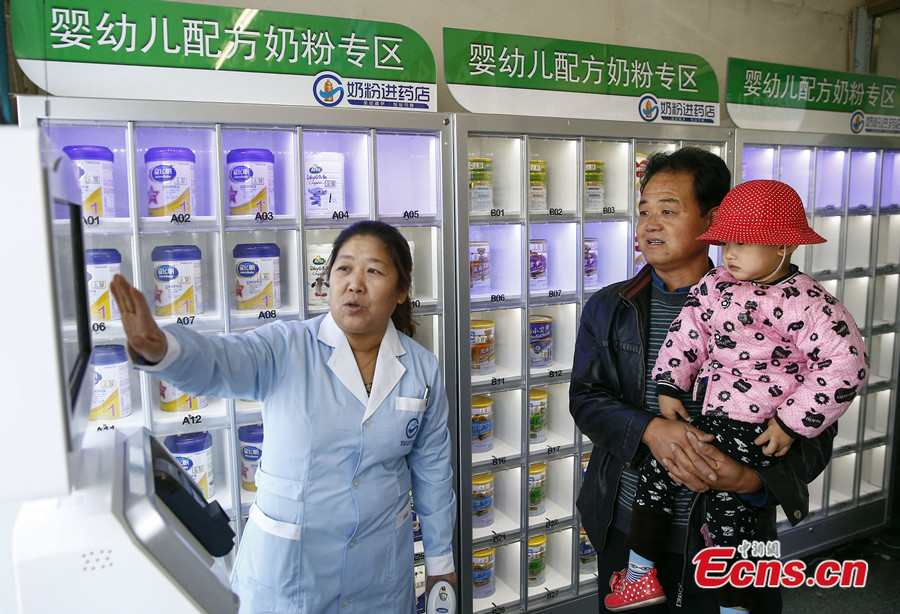 A staff member in a pharmacy introduces a vending machine equipped with tracking systems to sell baby formula in Beijing on October 26, 2013. Five pharmacies in the capital city started to sell baby formula on Saturday. Using the vending machines, customers can look up information on a product and pay for the item. [Photo: China News Service / Zhang Hao]