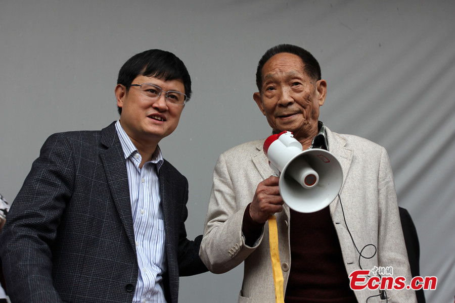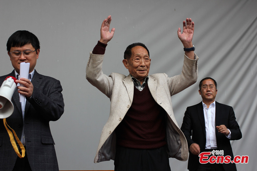 Chinese agricultural scientist Yuan Longping addresses a lecture, named "My Chinese Dream", at Nanjing University in Nanjing, capital of east China's Jiangsu Province, on October 27, 2013. Yuan, called "The Father of Hybrid Rice", is known for developing the first hybrid rice varieties in the 1970s in China. [CNSPHOTO]