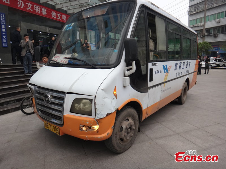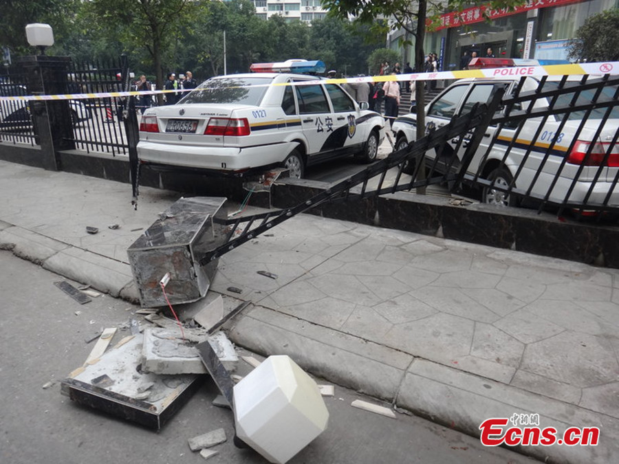 A man drives a minibus, attacking a local traffic police brigade and the intermediate people's court in Nanchong City of southwest China's Sichuan province on October 28, 2013. According to local authorities, two police officers were hurt and five police cars were damaged in the accident. The suspect was controlled and the case is under investigation. [Photo/CFP]
