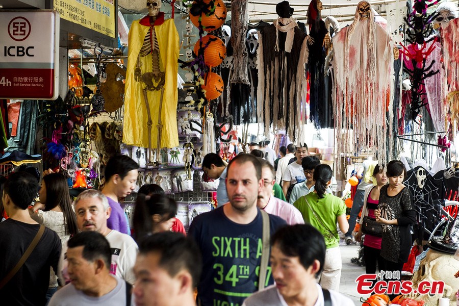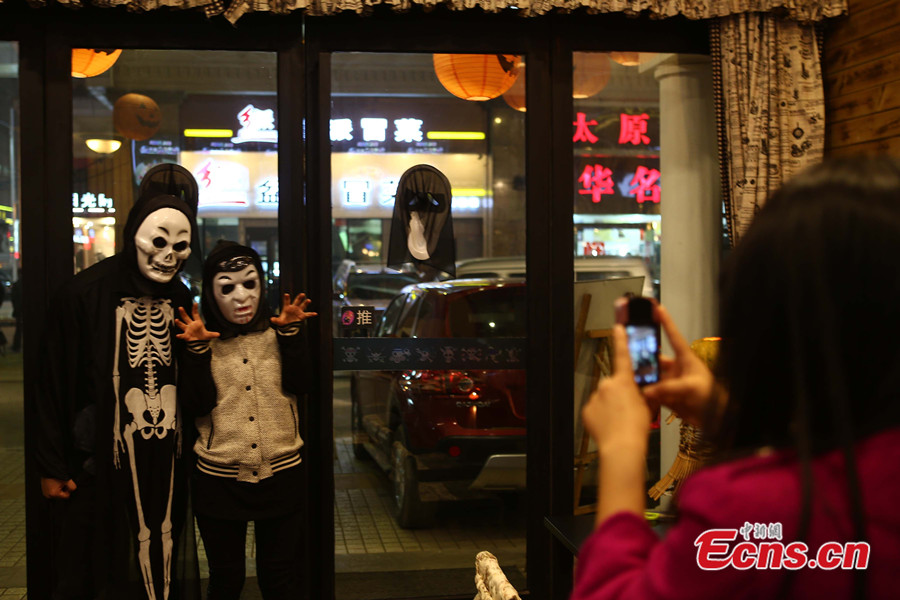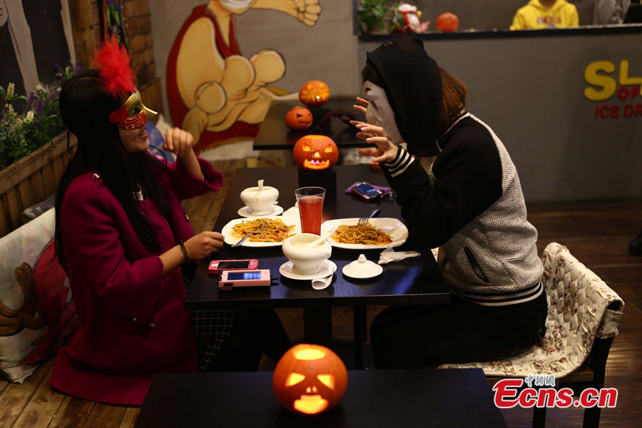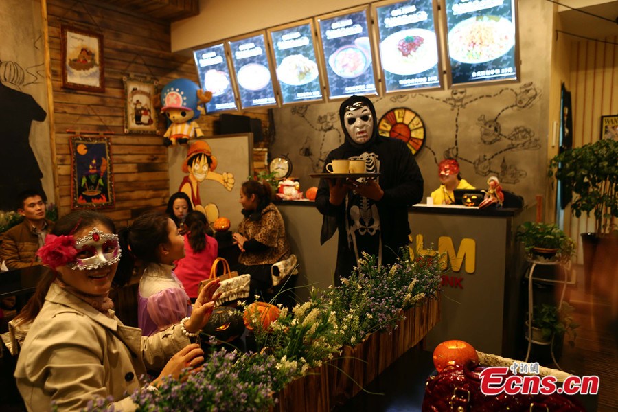A waiter dressed in Halloween costumes serves guests at a restaurant in Taiyuan of north China's Shanxi province on October 30, 2013. [Photo: China News Service / Zhang Yun]