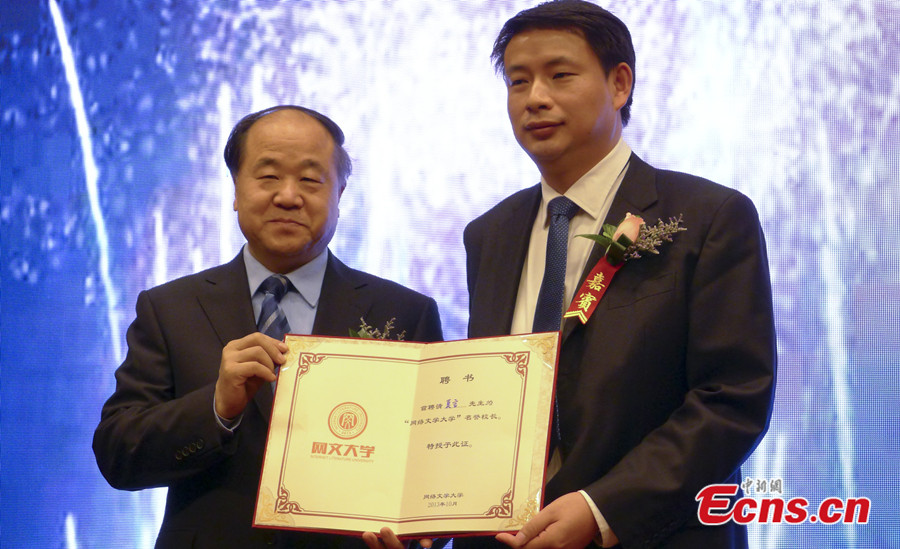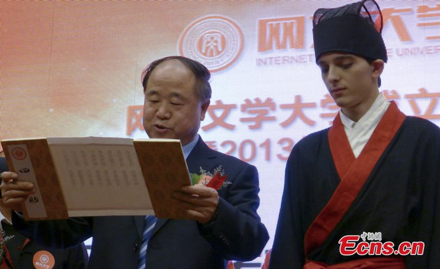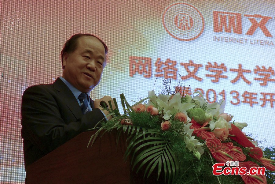Chinese Nobel Prize winner Mo Yan attends a founding ceremony of China's first network literature university at Confusion Temple in Beijing on October 30, 2013. Mo is appointed honorary president of the public university, which aims to cultivate authors of original literature works in China. [Photo: China News Service / Du Yan]