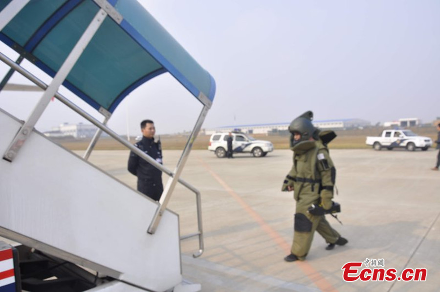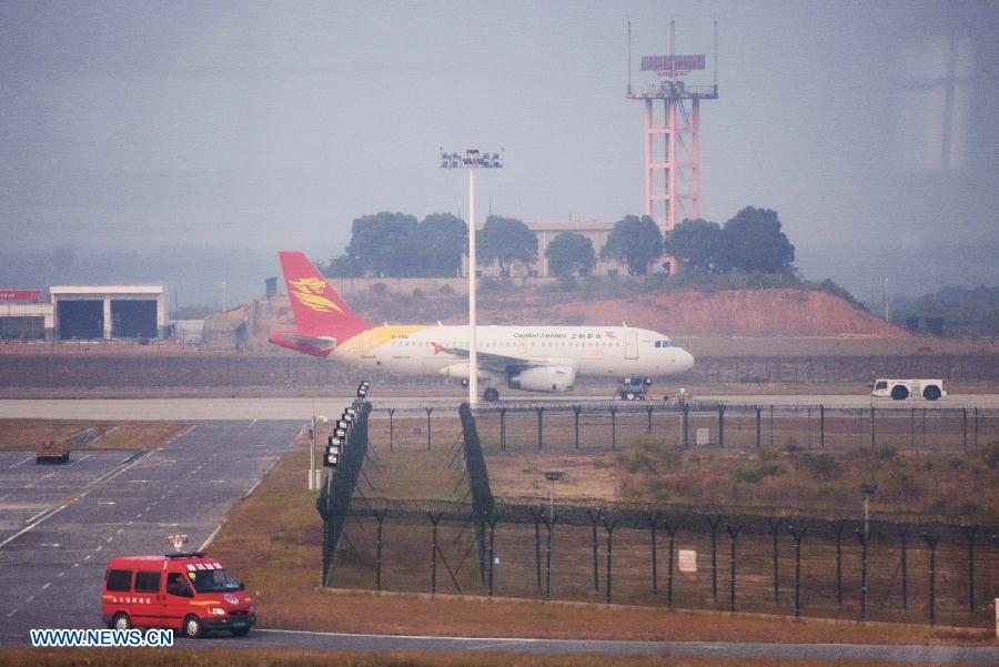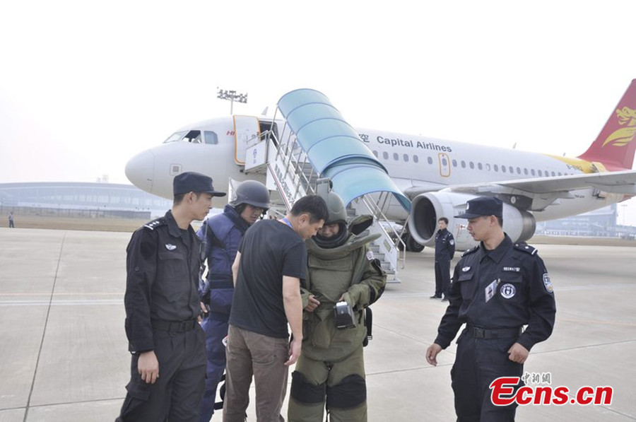 The plane JD5662 from Changsha to Hangzhou is parked at a separated zone at the Changbei Airport of Nanchang City, east China's Jiangxi Province, Oct. 31, 2013. The Flight JD5662 of Capital Airlines, a regional carrier, landed in Nanchang at 1:01 p.m. after the airline received a bomb threat call at 12:45 p.m. No bombs were found after a search of Flight JD5662. The 136 passengers aboard the plane went through another round of security checks at about 5 p.m. and the plane was due to take off. (Xinhua/Zhou Mi)