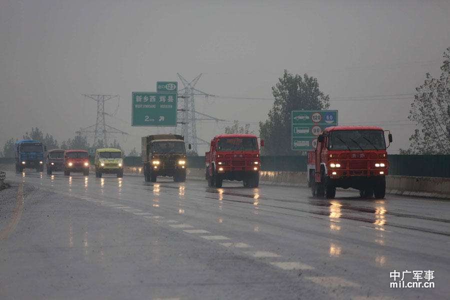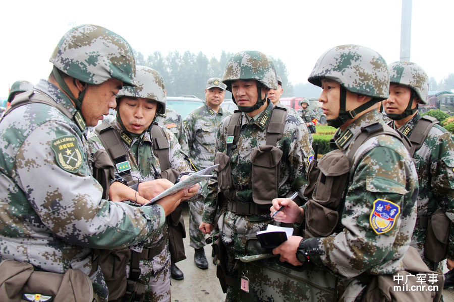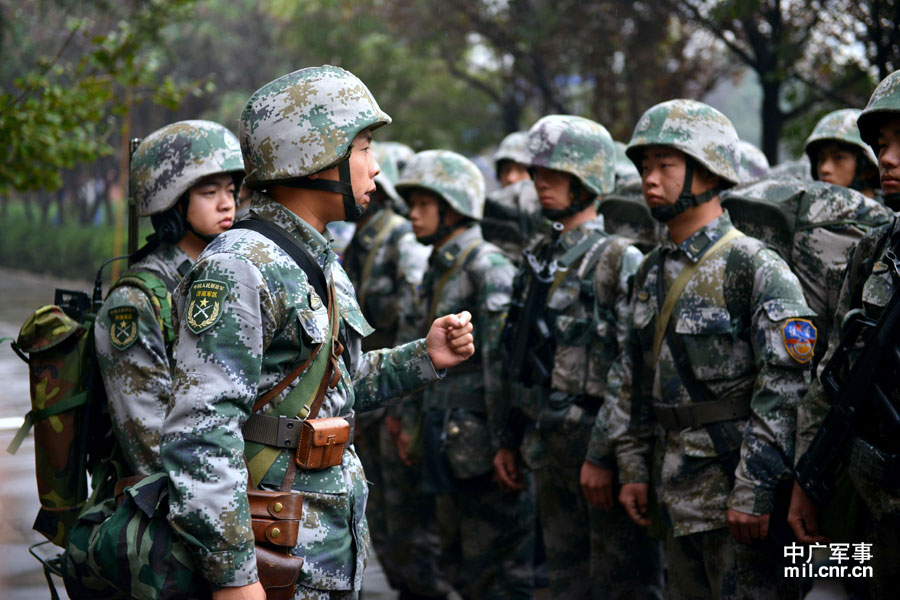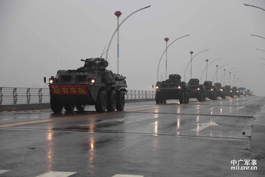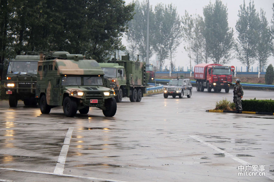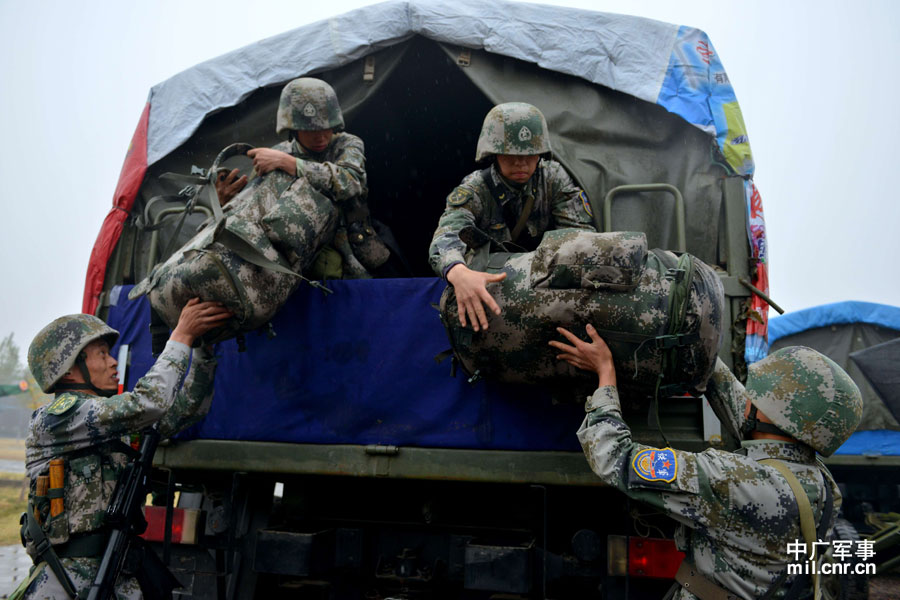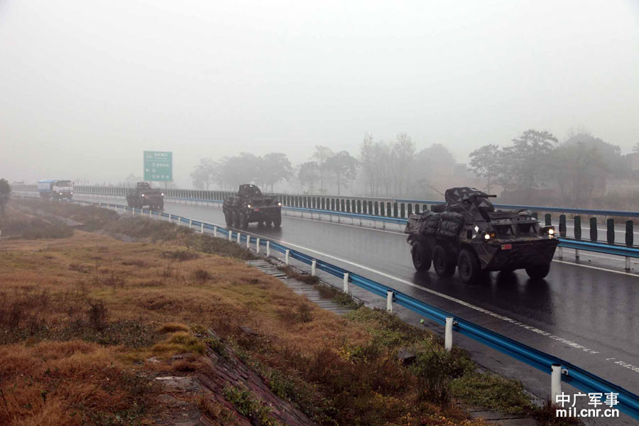 Soldiers assemble during the exercise dubbed as "Queshan - 2013A" by the Jinan Military Area Command of the Chinese People's Liberation Army (PLA) on Nov. 3, 2013. The PLA servicemen are on the way to the Queshan training base on Sunday morning. After a long-distance maneuver, the brigade will fight fictitious "Blue Army" targets with live ammunition, according to Army sources.(Source: mil.cnr.cn/Sun Jieshen/Shen Dong Dong/Liu Jian)