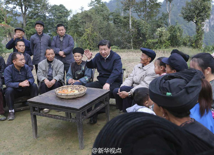 Chinese president Xi Jinping inspects poverty reduction work at Tujia Miao Autonomous Prefecture of Xiangxi in central China's Hunan province on November 3, 2013. [Photo/Xinhua]