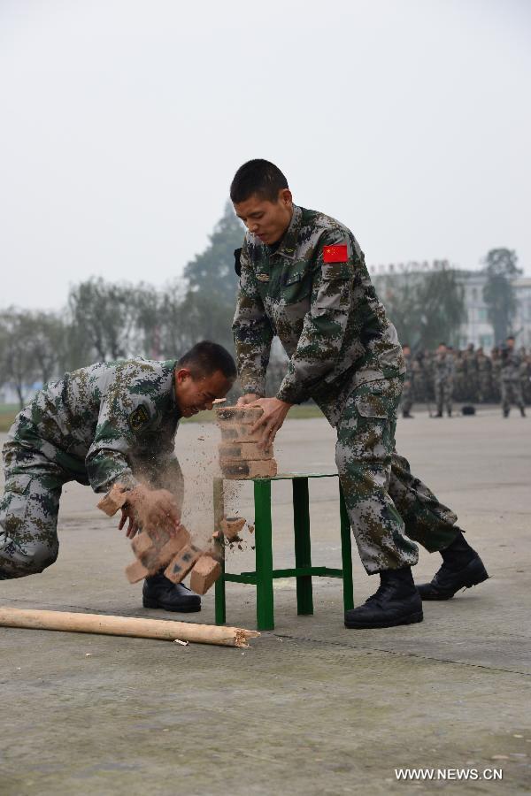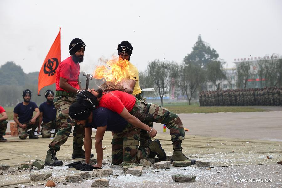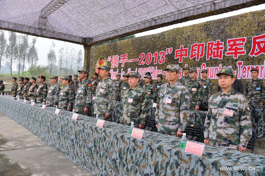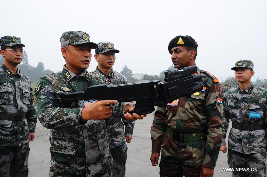 Chinese soldiers take part in a China-India joint anti-terrorism military training drill in southwest China's Sichuan Province, Nov. 5, 2013. China and India each sent one company of 144 soldiers to participate in the training code-named "Hand-in-Hand 2013," which started on Tuesday. This is the third time for China and India to conduct their joint anti-terror training. (Xinhua/Wang Desi)