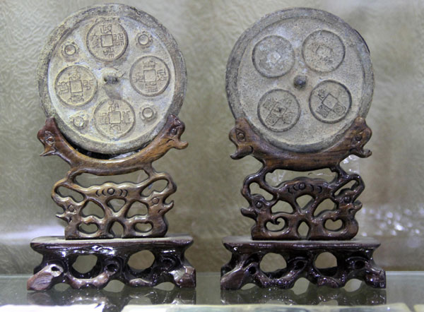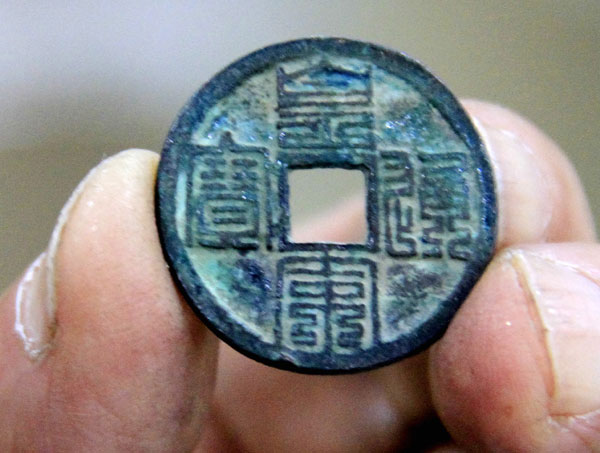 A series of ancient Chinese coins are on display in an exhibition held in Nanjing, capital of East China's Jiangsu province, where a variety of ancient currencies including banknotes in trillion denomination, stamp-like paper currencies and 'huangsongtongbao' coins, were unveiled, Nov 3, 2013. Over 1000 kinds of paper currencies and old coins from home and abroad were on show. [Photo by Dong Jinlin/Asianewsphoto]