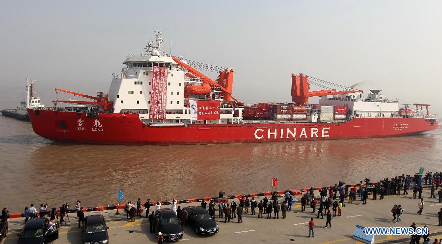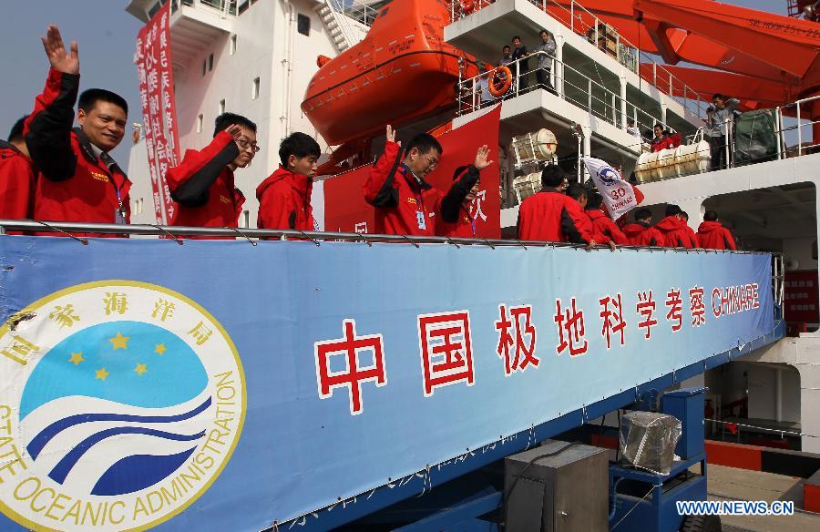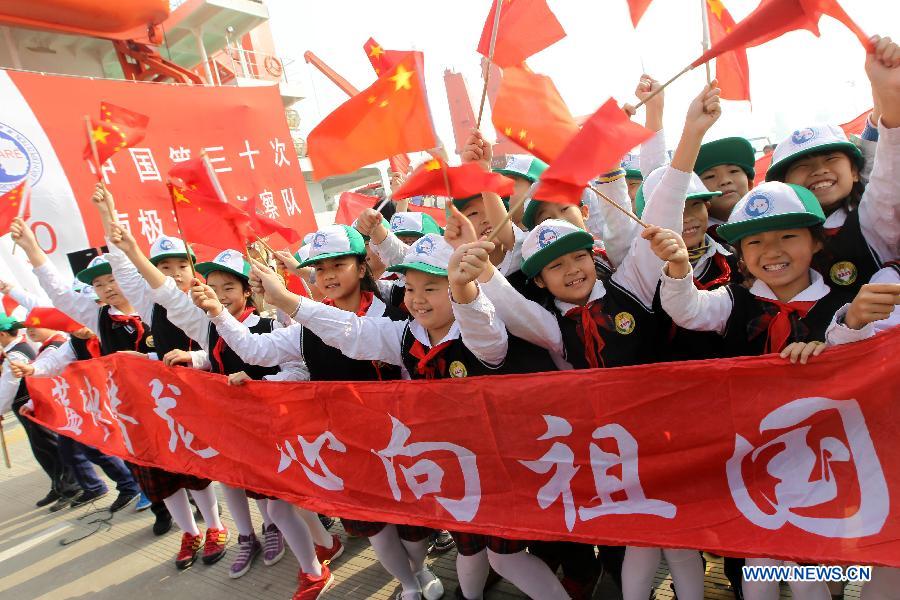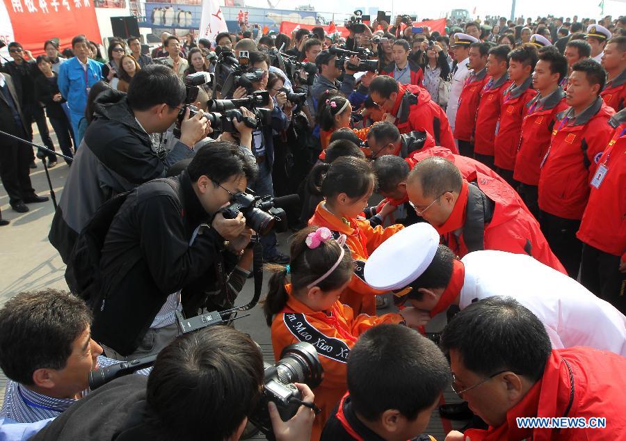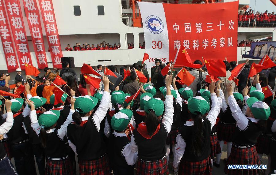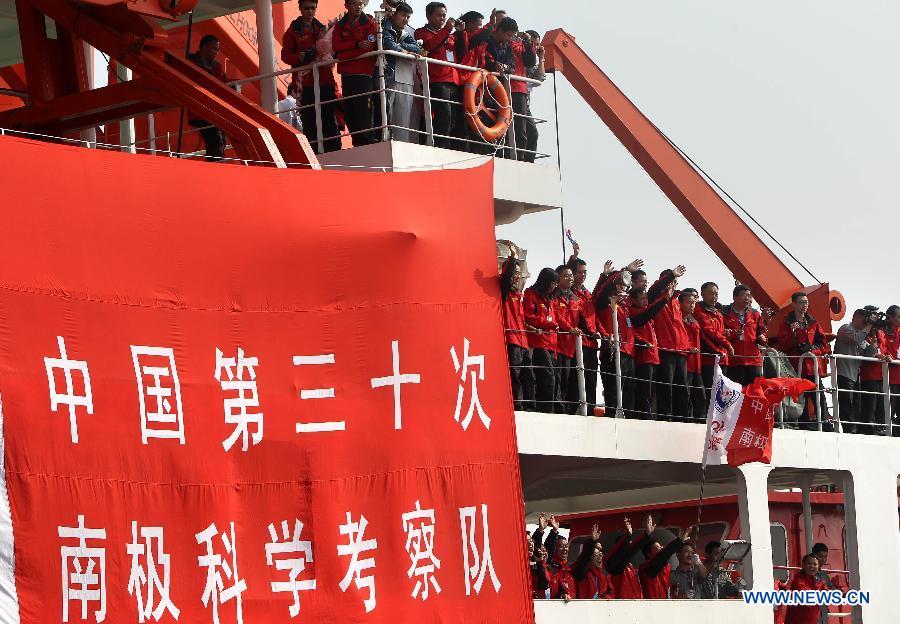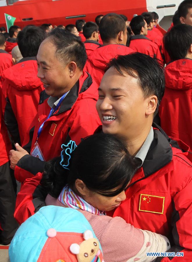 Wang Wencheng (R, front), a member of the Chinese scientific expedition team, hugs his wife before leaving Shanghai, east China, Nov. 7, 2013. Chinese research vessel and icebreaker Xuelong (Snow Dragon) left Shanghai on Thursday, setting sail on the country's 30th scientific expedition to Antarctica. The 256 member team, including scientists from Taiwan and Thailand, will work on 30 assignments, take supplies to China's Antarctic stations, set up China's fourth research station, the "Taishan", and chose a site for another new station. The expedition will last for 155 days, covering 31,500 nautical miles over its entire course. The team is expected to return home in April, 2014. (Xinhua/Pei Xin)