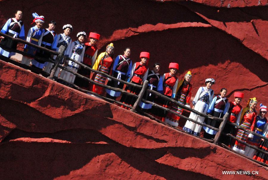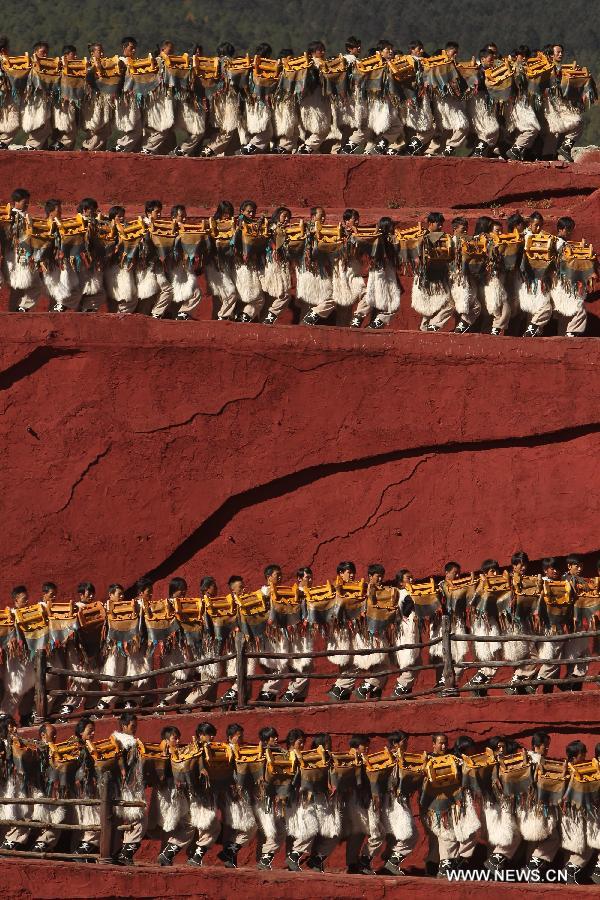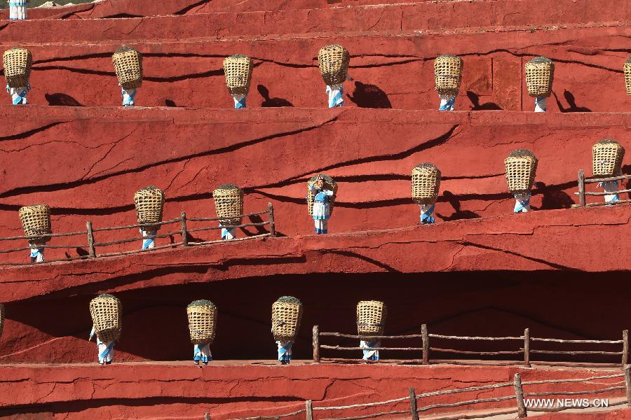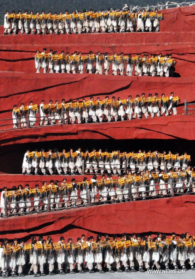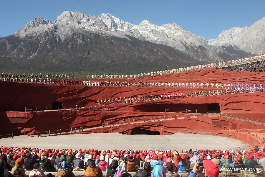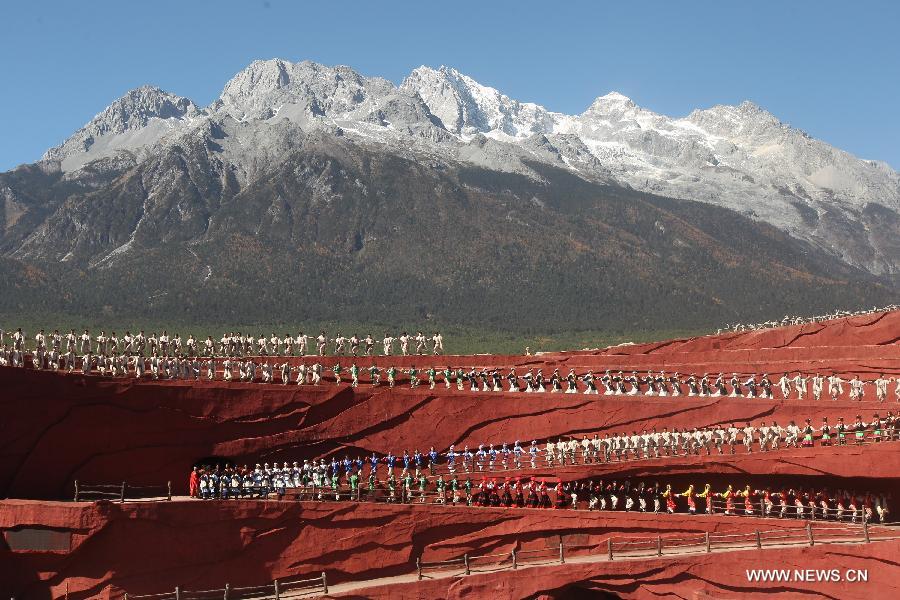Actors perform during the cultural show "Impression Lijiang" in Lijiang, southwest China's Yunnan Province, Nov. 10, 2013. The show, staged in front of the Yulong (Jade Dragon) Snow Mountain, demonstrated the traditions and lifestyles of Naxi, Yi and Bai minorities in Lijiang. (Xinhua/Zhai Zihe)