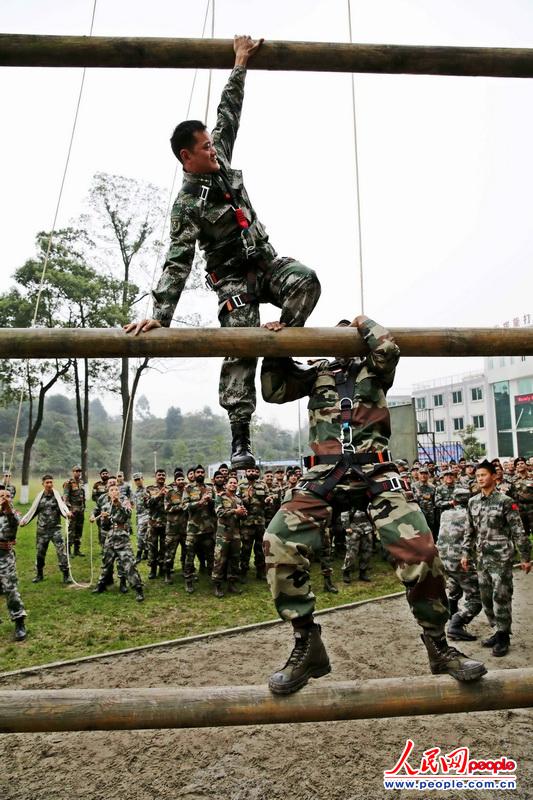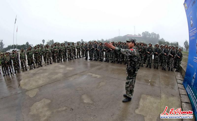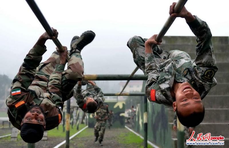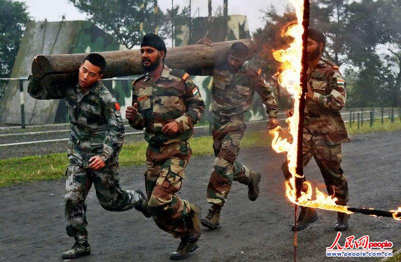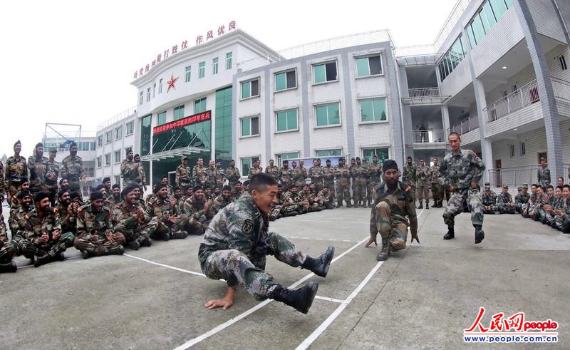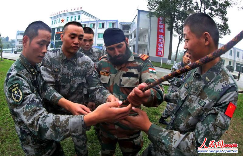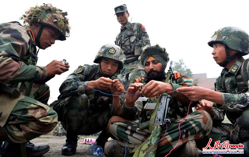 The Chinese and Indian officers and men participating in the China-India joint anti-terrorism military training code-named "Hand-in-Hand 2013" are conducted mixed joint training on November 7, 2013. The Chinese and Indian officers and men are in coordinated training. (Source: People’s Daily Online/Du Li)