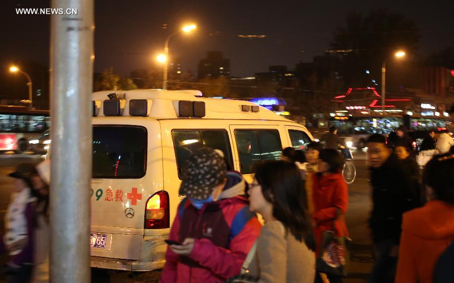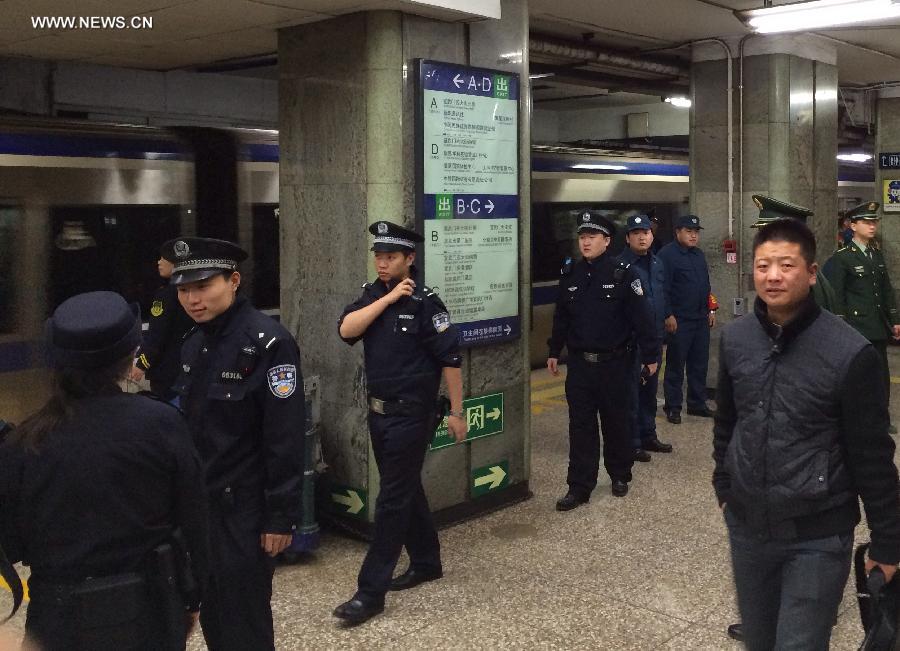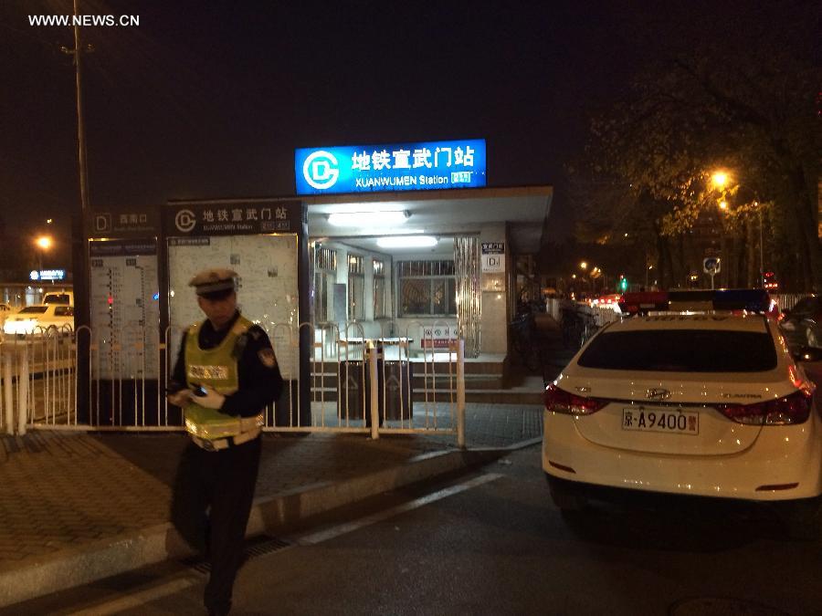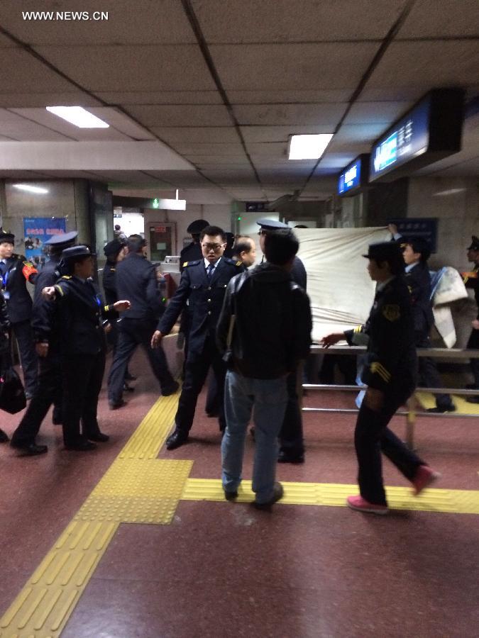 Rescuers carry out the man who jumped off the platform at the Xuanwumen Station on Subway Line 2, in Beijing, capital of China, Nov. 11, 2013. Subway Line 2 was halted after a man jumped off the platform killing himself at a downtown station in Beijing on Monday. The station was forced to close and trains on the line had to be halted. The service resumed at 5:41 p.m. on Nov. 11. (Xinhua/Yang Yichen)