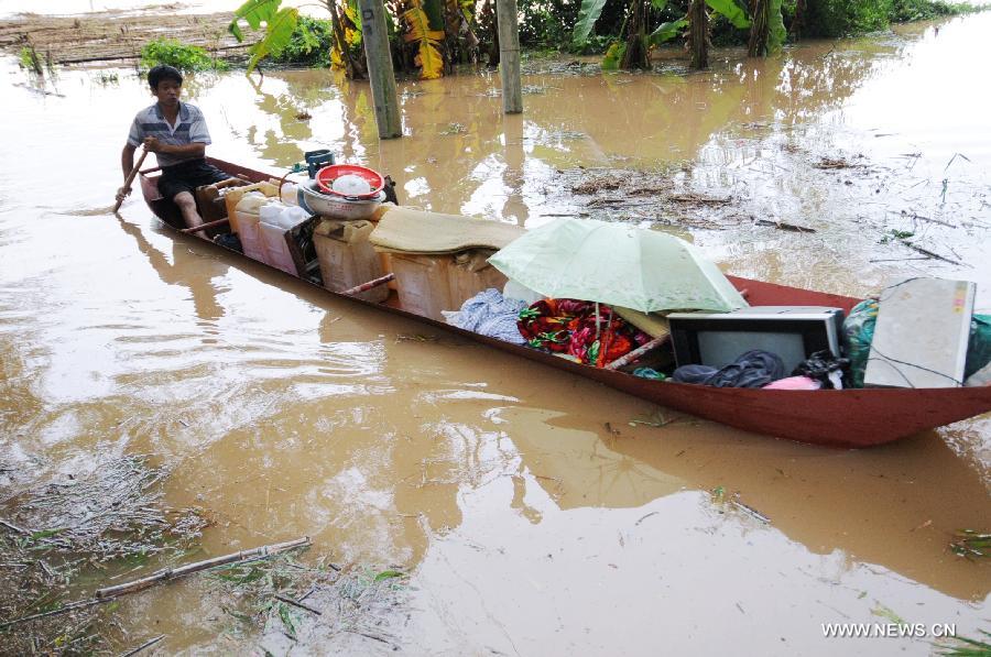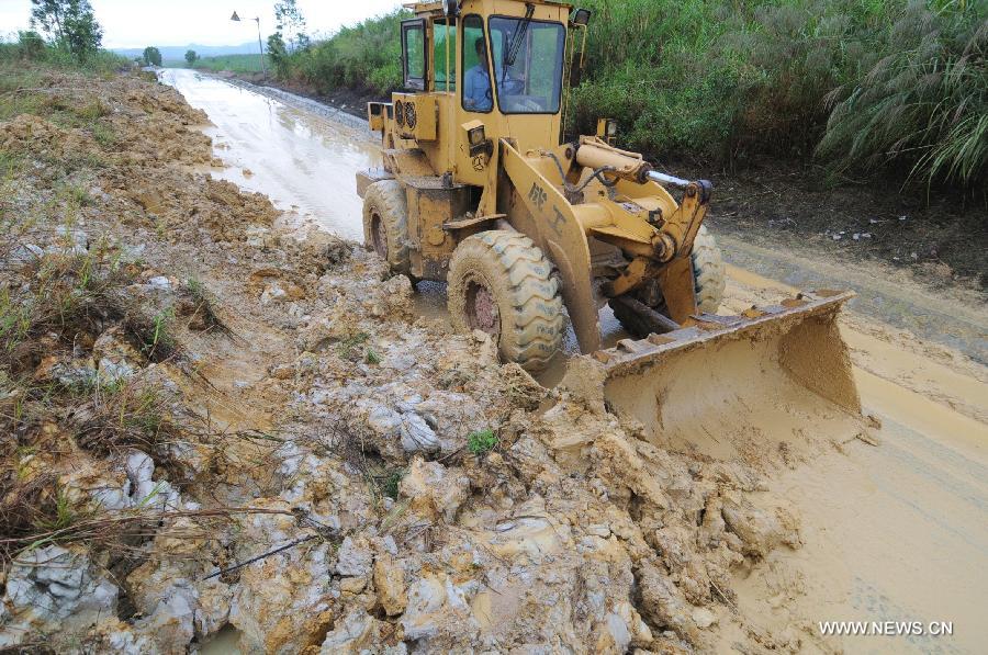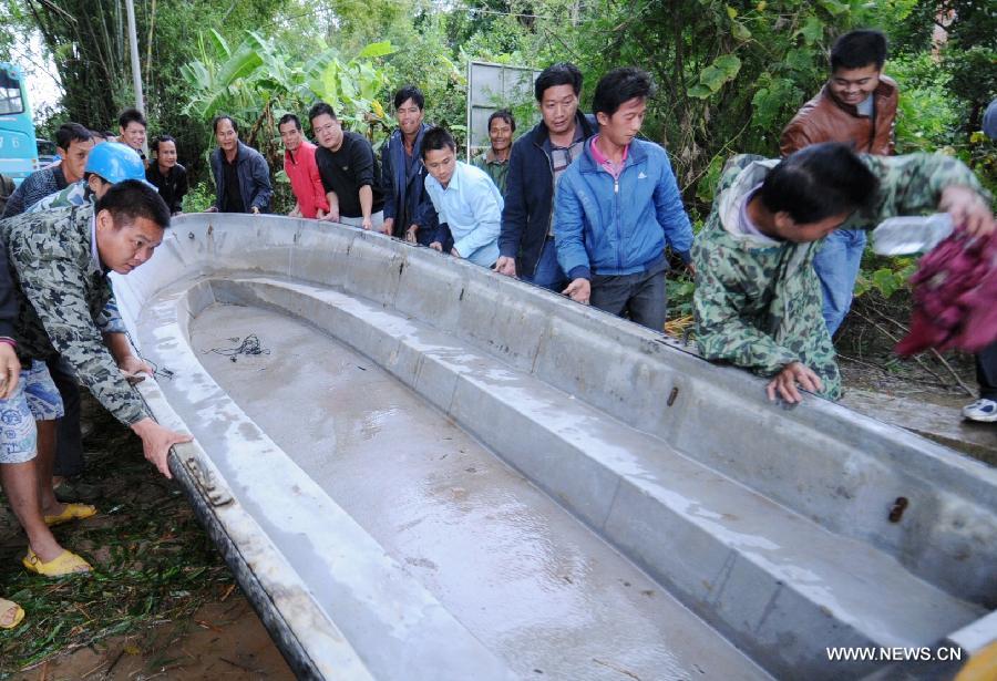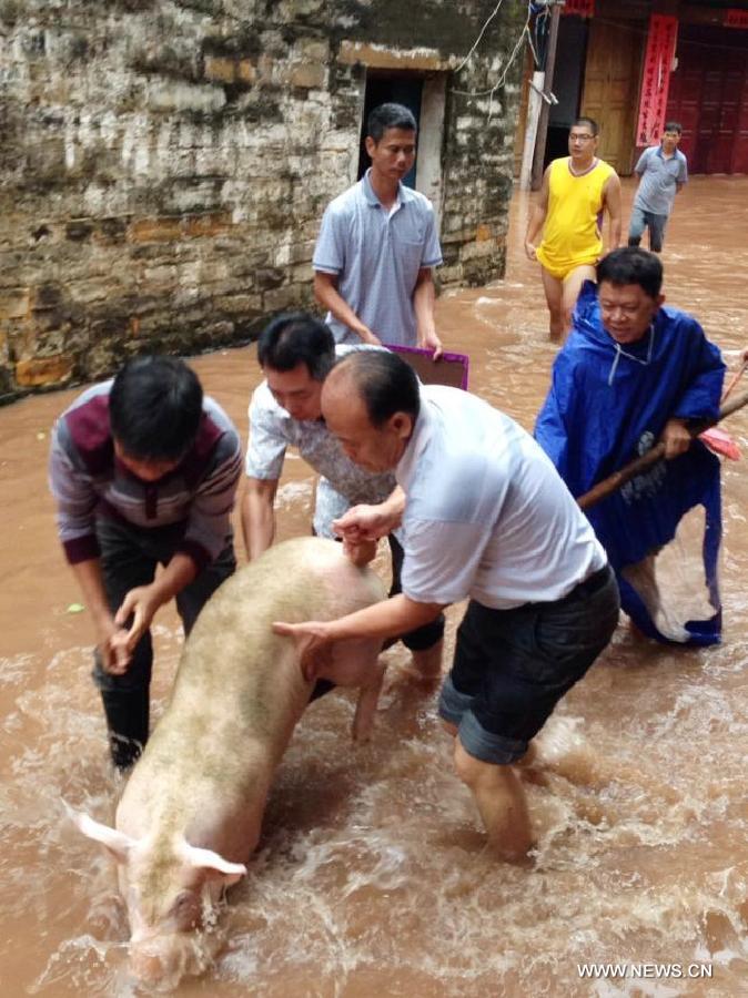 Residents catch an escaped pig in Tuocong Village of Shangsi County, south China's Guangxi Zhuang Autonomous Region, Nov. 11, 2013. Brought by Typhoon Haiyan, gales and rainstorms hit Guangxi recently, causing serious damages and economic losses to local residents. (Xinhua/Liang Fuying)