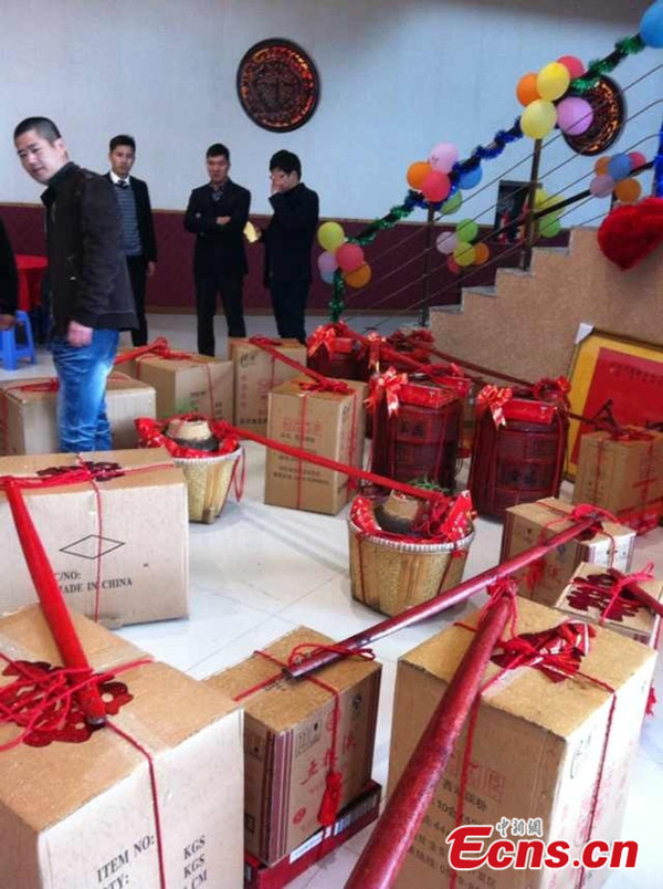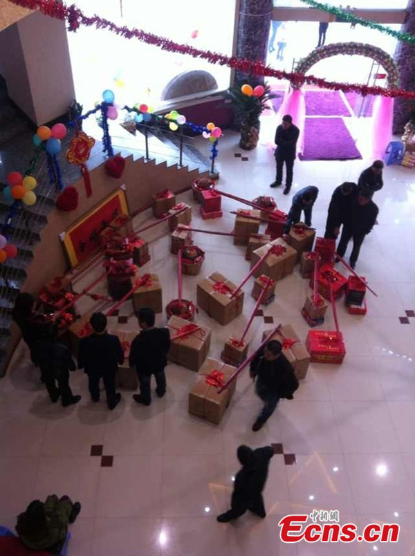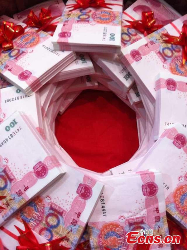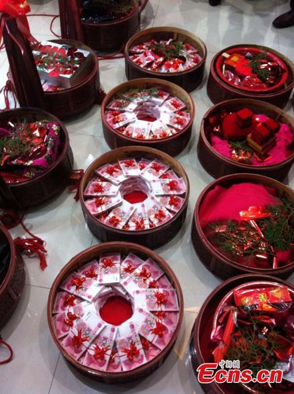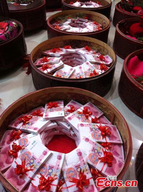 A prospective groom sends 8.88 million yuan in cash as betrothal gifts at an engagement ceremony in Yiwu of Zhejiang province on November 12, 2013. [Photo/IC]