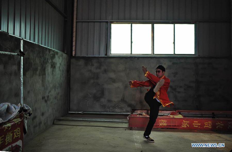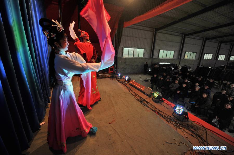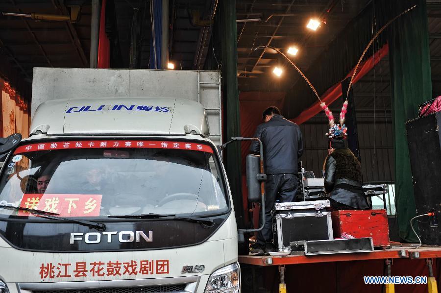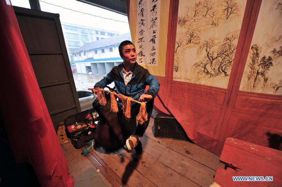 An actor of the Taojiang County Huagu Opera Troupe prepares for the performance at Zuojialun Village of Yingfengqiao Town in Yiyang City, central China's Hunan province, Nov. 11, 2013. Being part of the activities of the 1st China Hunan Huagu Cultural Festival, several Huagu Opera troupes will go on a performing tour to 88 towns and villages in Yiyang. (Xinhua/Li Ga)