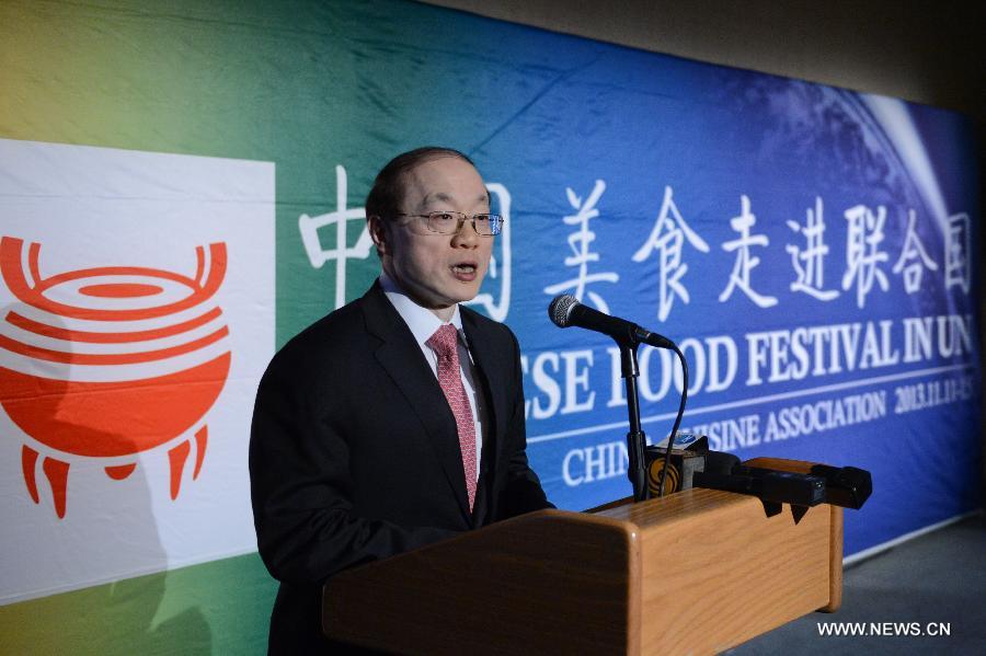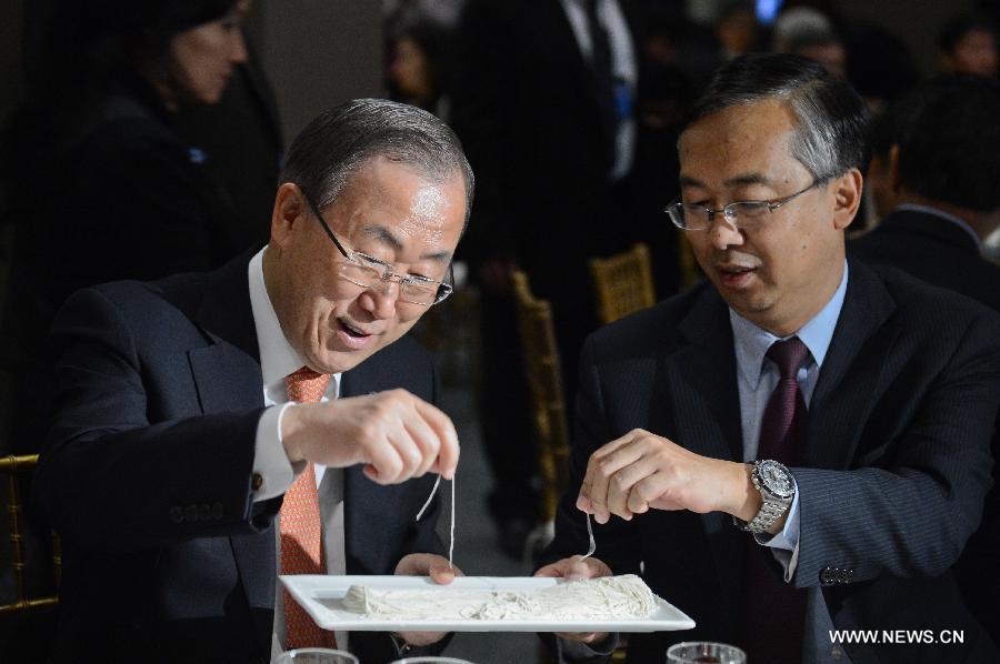 Guests help themselves during a promotional event for Chinese cuisine at the United Nations headquarters in New York, on Nov. 12, 2013. (Xinhua/Niu Xiaolei)