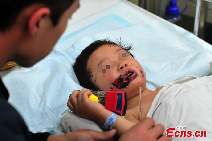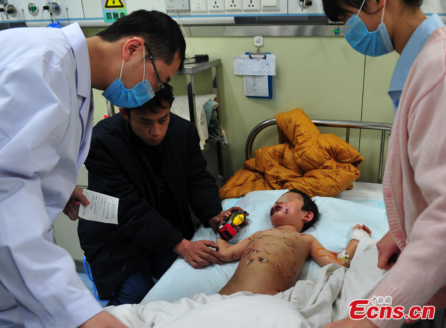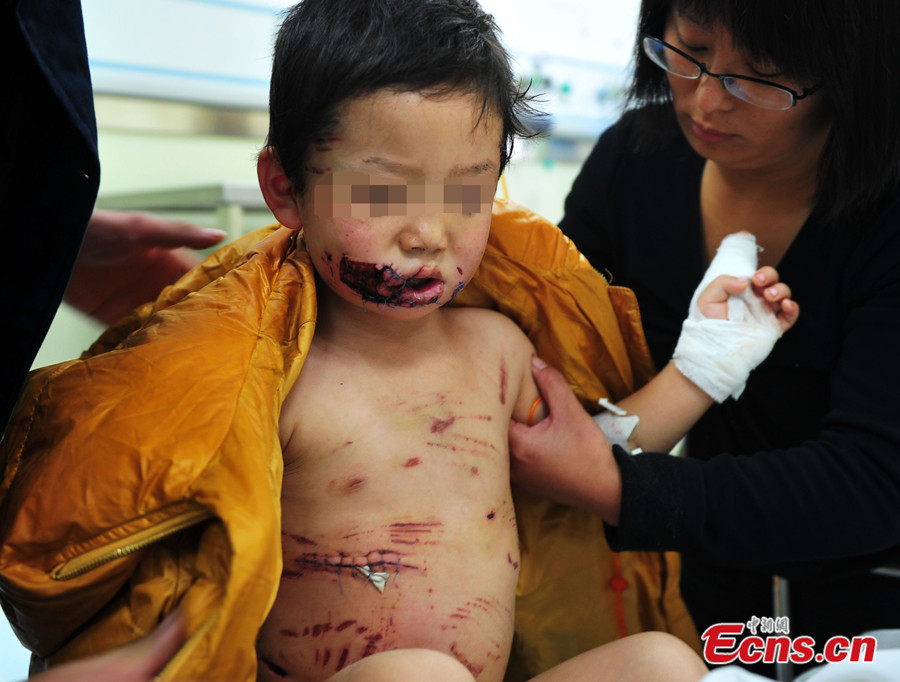 A three-year-old boy, attacked by three dogs, receives treatment at a hospital in Shijiazhuang of Hebei province on November 13, 2013. According to the boy's mother, the boy was attacked by three dogs at a dog farm, where she works, on November 11. He was seriously injured with many wounds on his body, arms and face, said Zhang Junqiao, a doctor of the hospital. The boy will also need orthopedic surgery even after recovery, the doctor added. [Photo: China News Service / Zhao Yujia]
