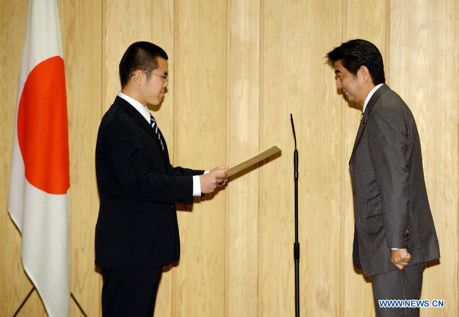 Photo taken in Tokyo on Nov. 13, 2013 shows Japanese Prime Minister Shinzo Abe (R) presents Chinese student Yan Jun who studied in Japan a reward to recognize his rescue work of saving a child from a typhoon-swollen river in Osaka on Sept. 16, 2013. (Xinhua)