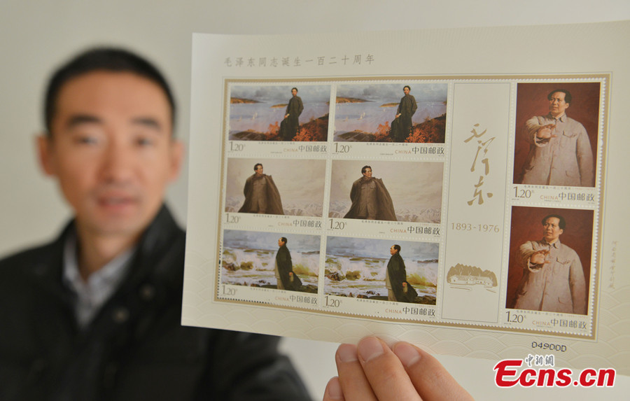 A staff member of the post office displays a set of stamps, featuring later Chinese leader Mao Zedong, at Fuyang of east China's Anhui province on November 14, 2013. The set of commemorative stamps will be issued by China Post Group on November 16 to mark the 120th anniversary of Mao Zedong's birth. [CNSPHOTO]