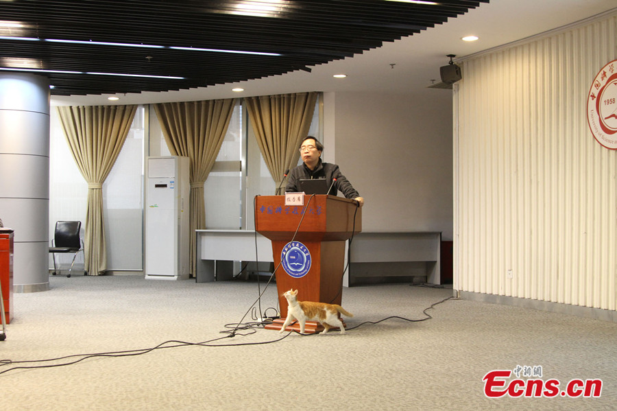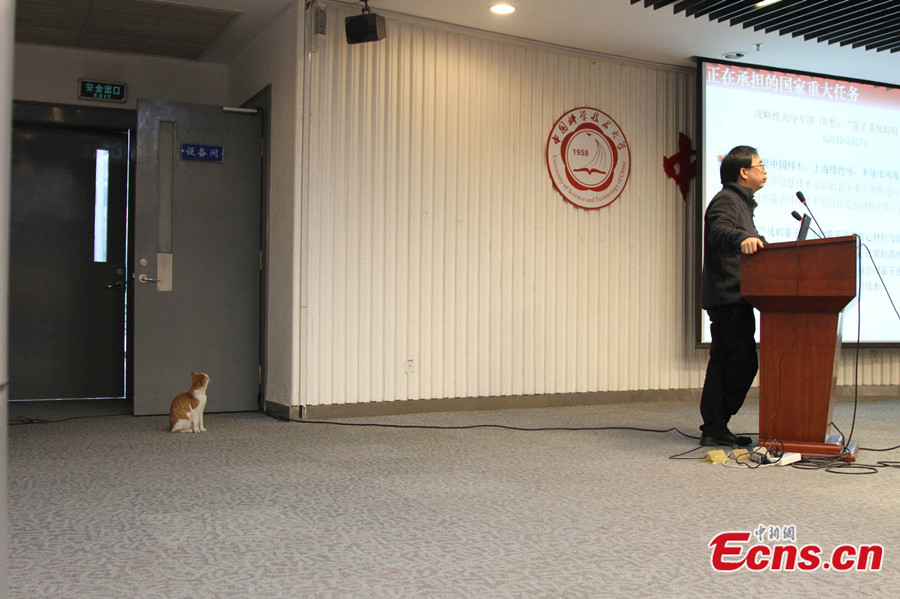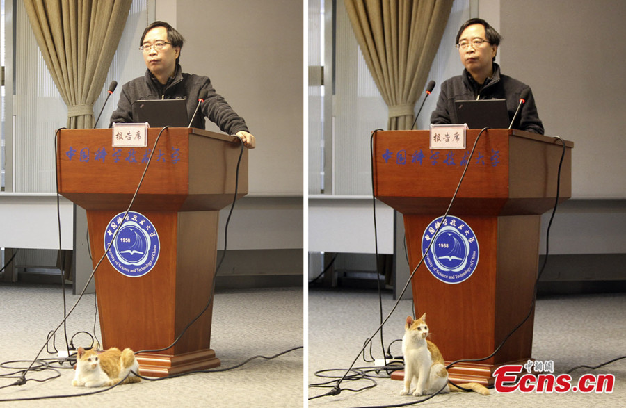 Photos show a yellow and white cat on the rostrum where Professor Pan Jianwei, an expert in the field of quantum mechanics, gives a lecture at the University of Science and Technology of China on Nov. 12, 2013. The cat later was dubbed "Schrödinger's cat" by students. [Photo: China News Service/ Yao Qiong]