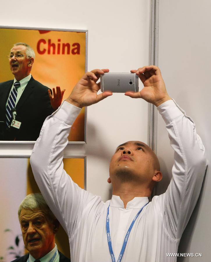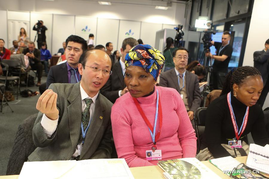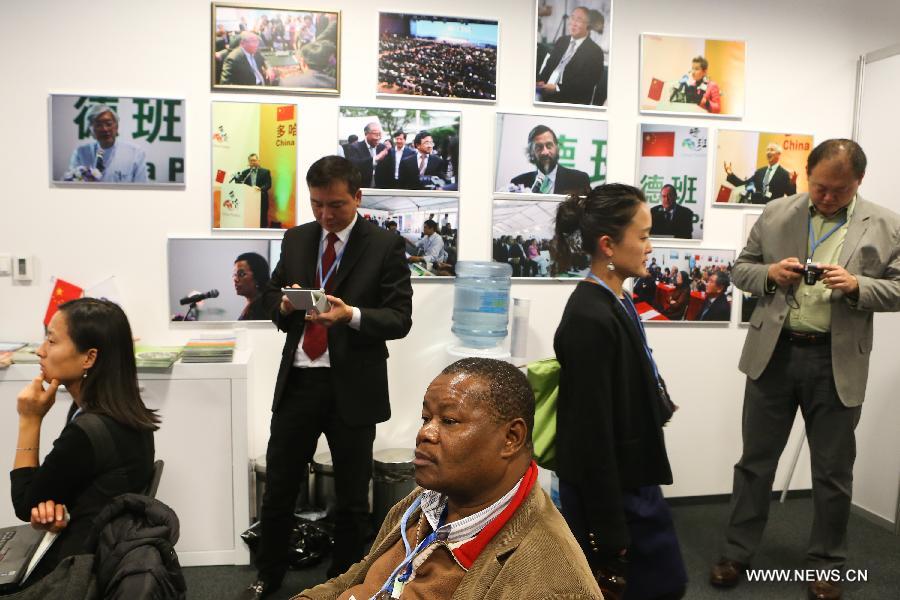 Delegates talk during the first event of China Pavilion at UN Climate Change Conference 2013 in Warsaw, Poland, on Nov. 14, 2013. Kicked off on Thursday, the China Pavilion would showcase 17 events including forums and exhibitions featuring China's efforts and achievements in addressing the climate change, leading with a seminar on Property Right and Standardization of Forestry Carbon Sinks. (Xinhua/Zhang Fan)