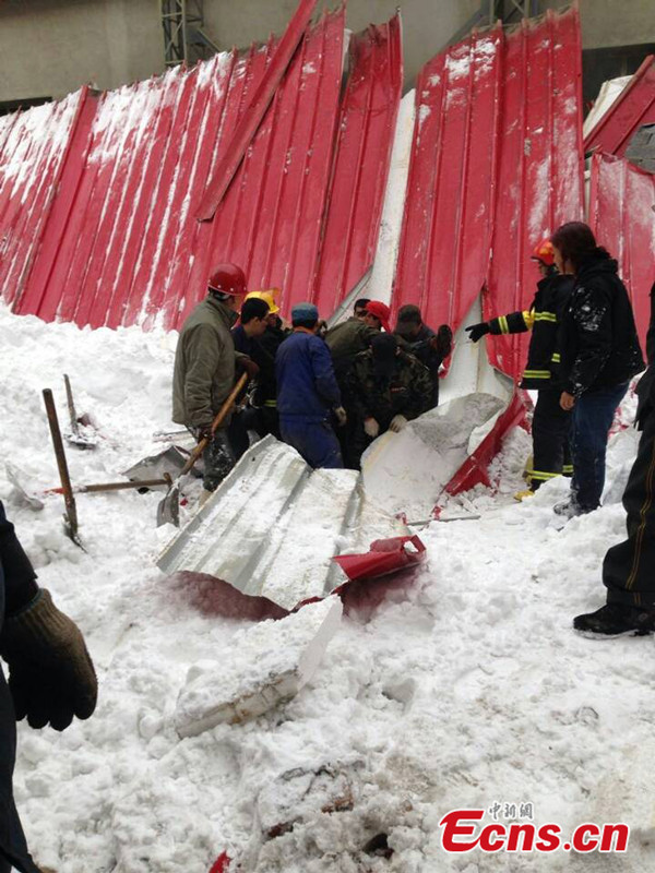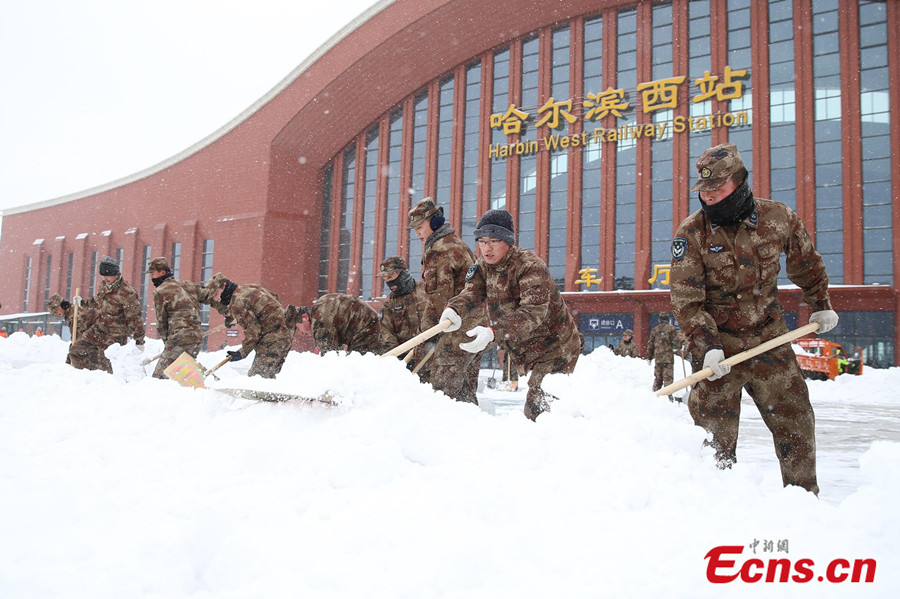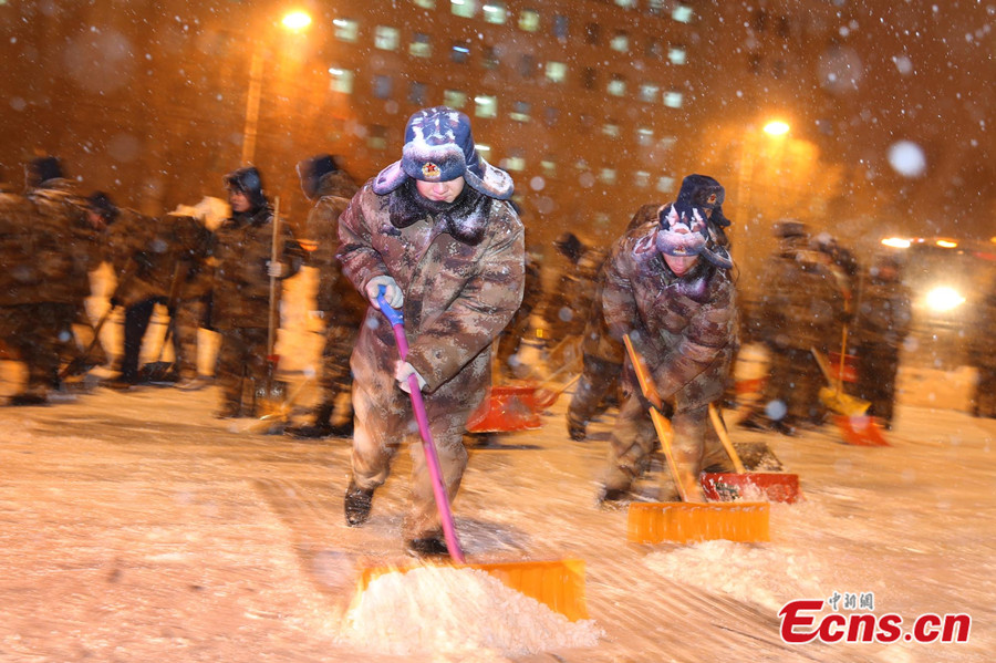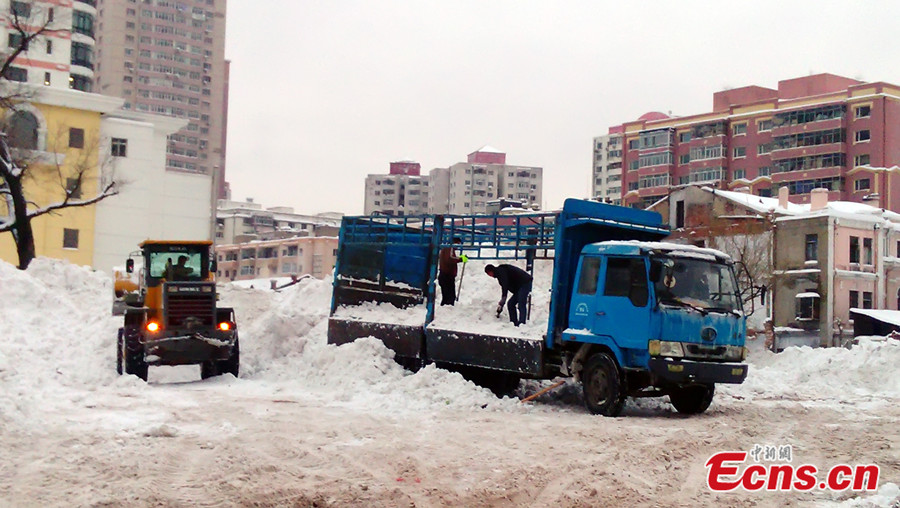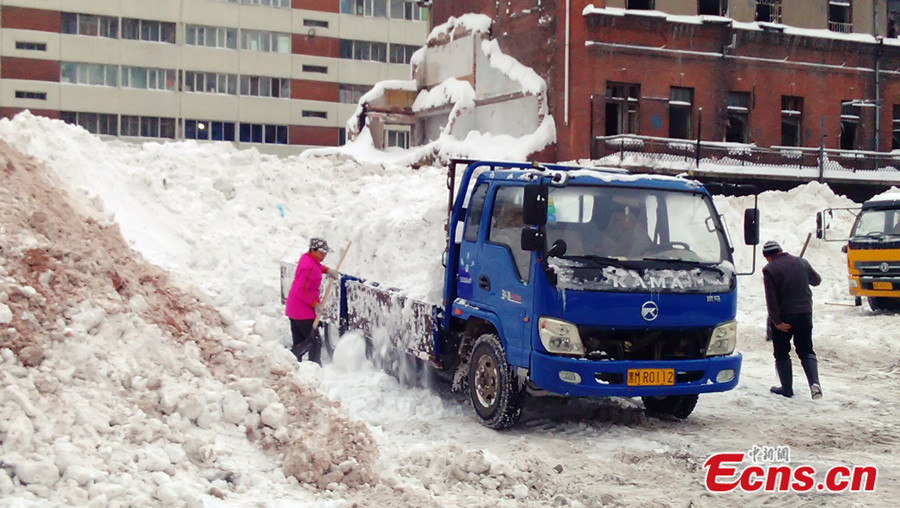 People clear snow in Harbin city, capital of Northeast China's Heilongjiang province, on November 19, 2013. Over 50,000 people, including residents, police and volunteers, were mobilized Tuesday to clear snow in Harbin after the worst snowstorm in 50 years hit the city for 60 hours. [Photo: China News Service /Wang Lin]