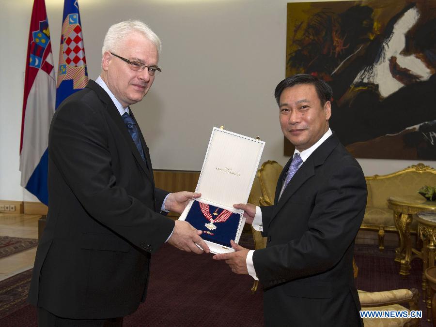 Croatian President Ivo Josipovic (L) awards the Red Kneza Branimira to Chinese Ambassador to Croatia Shen Zhifei at the Presidential House in Zagreb, Croatia, Nov. 20, 2013. (Xinhua/Miso Lisanin)