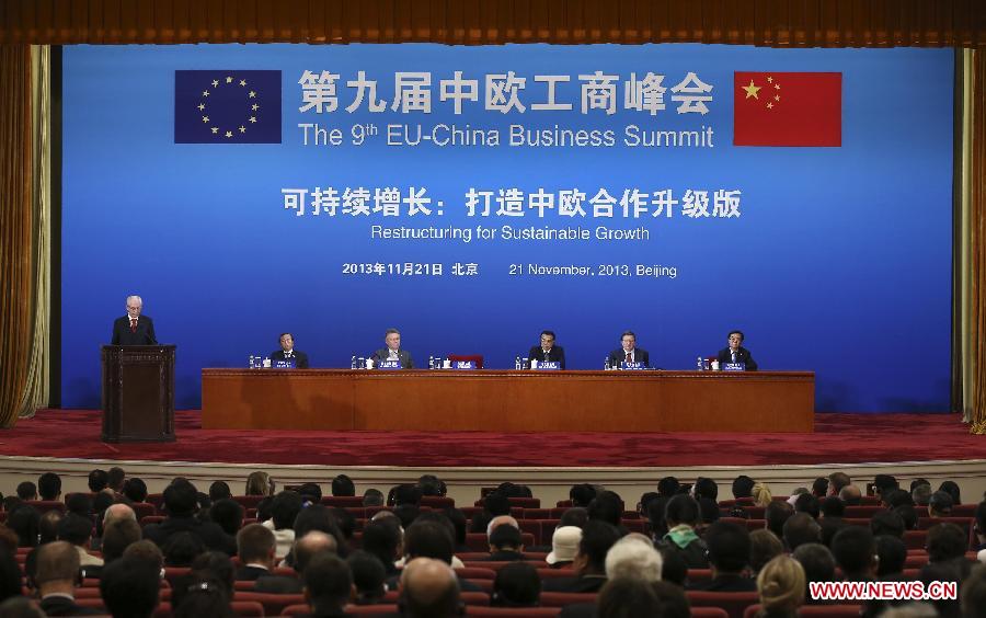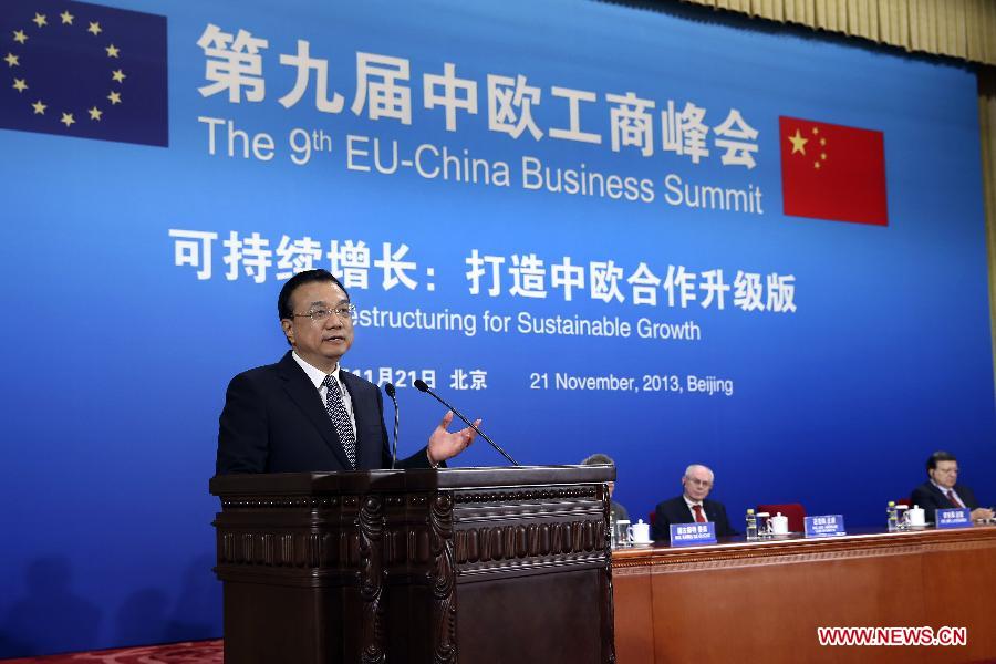 Chinese Premier Li Keqiang addresses the 9th EU-China Business Summit in Beijing, capital of China, Nov. 21, 2013. (Xinhua/Pang Xinglei)