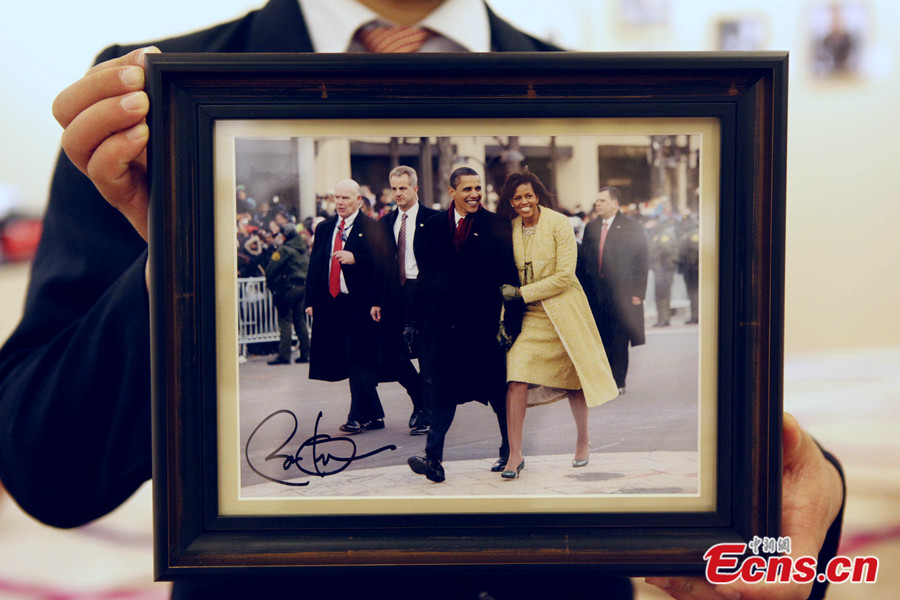 A picture with the signature of Barack Hussein Obama II is sold for 82,800 yuan at 2013 autumn auction of China's first mainland auction house, China Guardian, on November 24, 2013 in Beijing. The colorful picture was taken on January 20, 2009 when Barack Hussein Obama II was Sworn in as the 44th President of the United States in Washington D.C.. [Photo: China News Service / Yang Kejia]