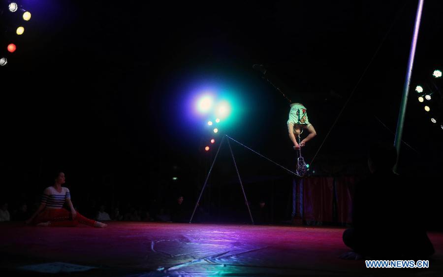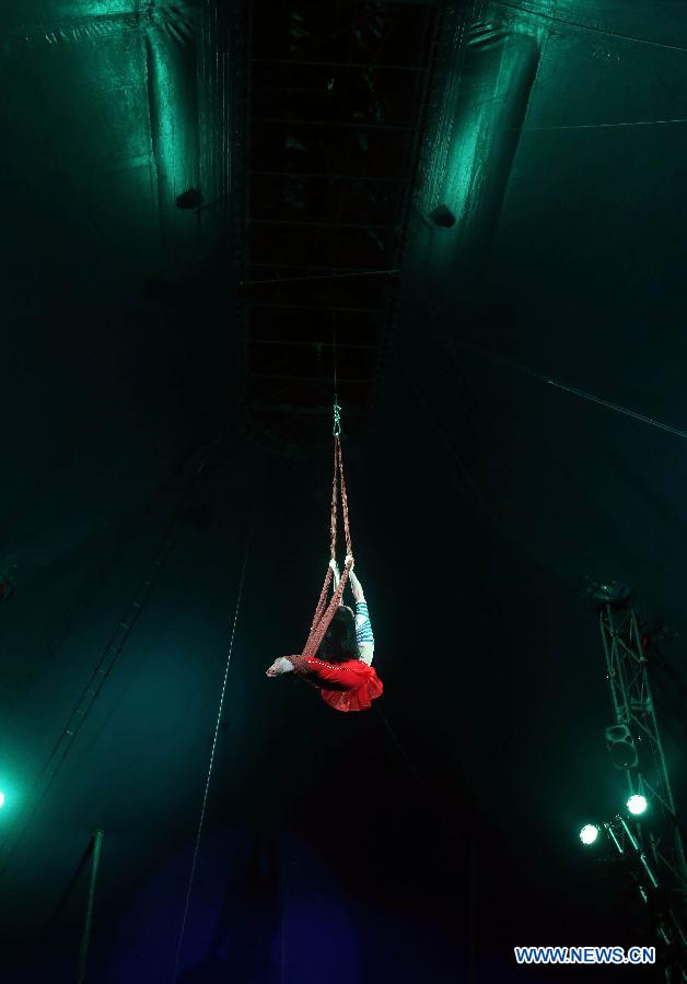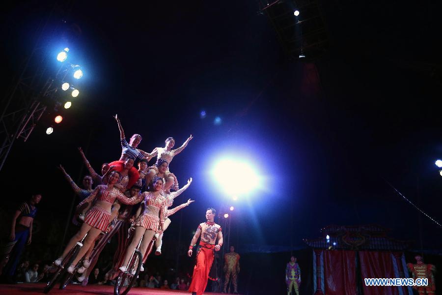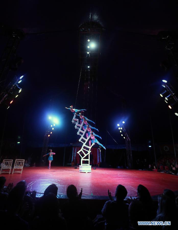 Chinese actresses perfrom during an acrobatic drama named "A Beautiful Dream" in Cologne, Germany,on Nov. 24, 2013. (Xinhua/Luo Huanhuan)