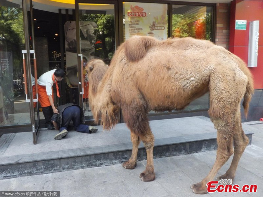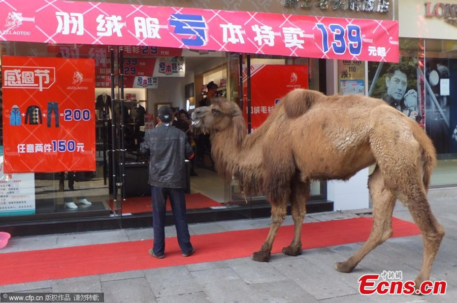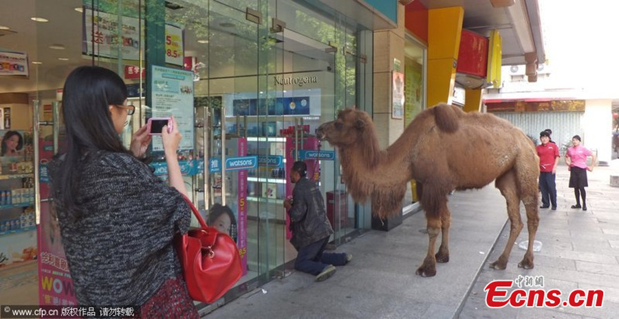 A man, leading a camel, begs for money in the downtown of Shaoxing city, east China's Zhejiang province on November 25, 2013. [Photo/CFP]