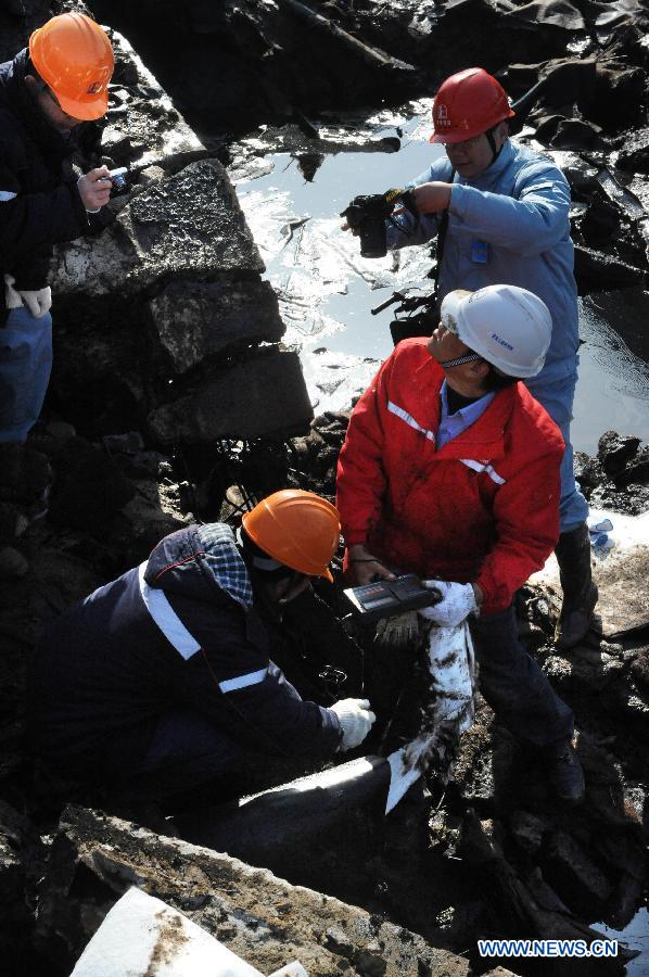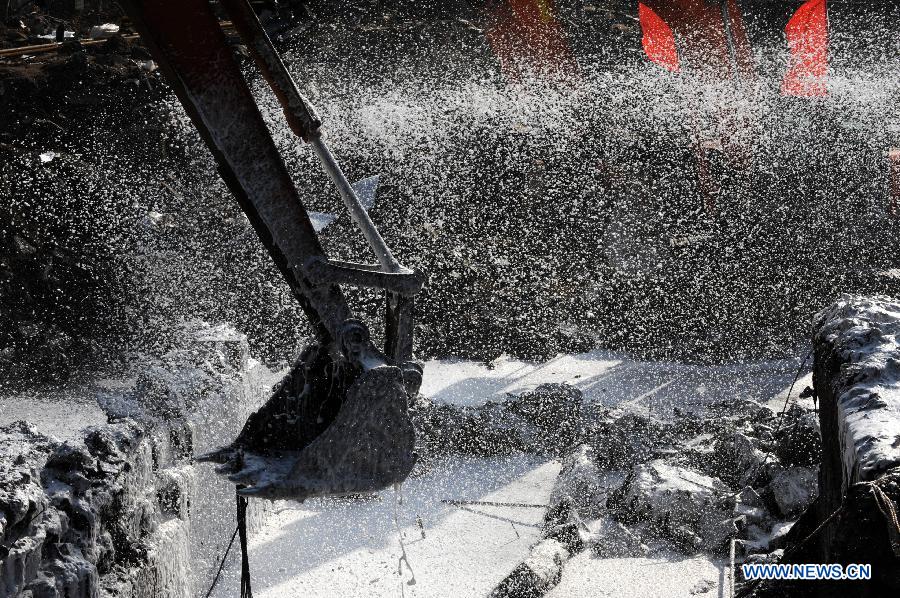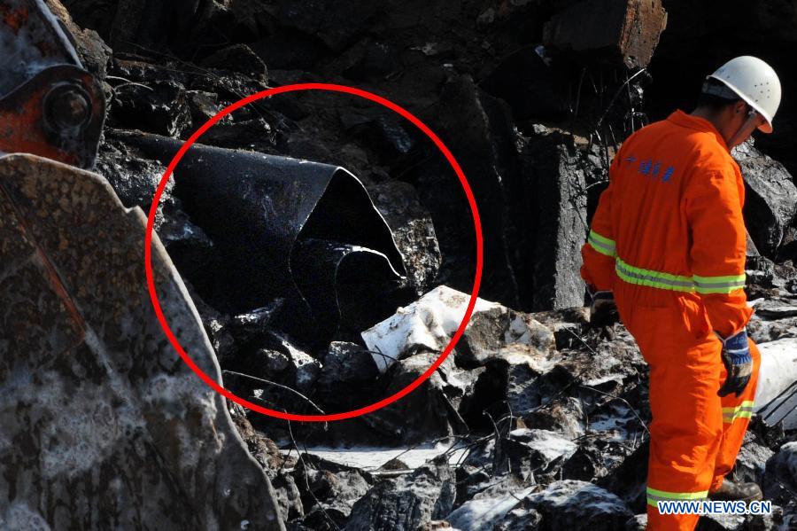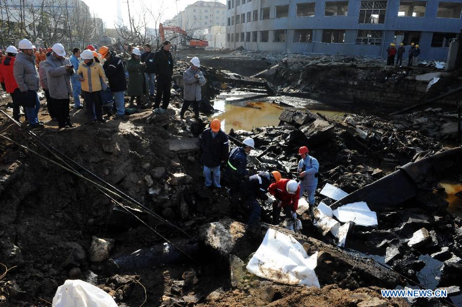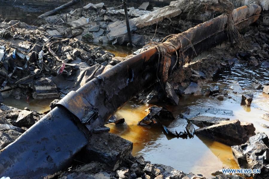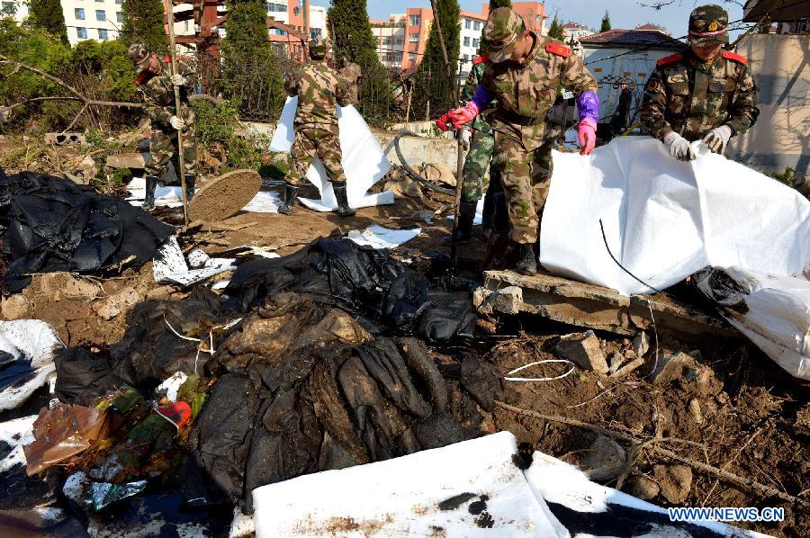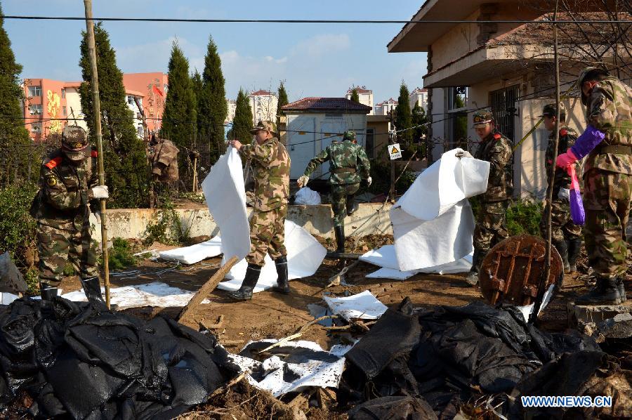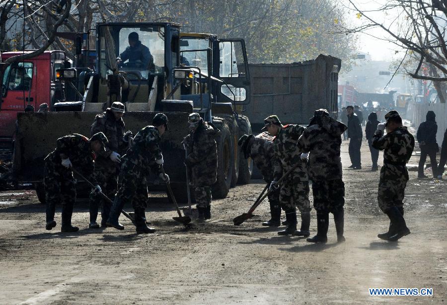 Soldiers clear the debris after a leaking pipeline caught fire and exploded in Qingdao, a coastal city in east China's Shandong Province, Nov. 25, 2013. The death toll from last Friday's oil pipeline blasts rose to 55 as of Monday. The blasts also left nine people missing and 136 others injured. (Xinhua/Feng Jie)
