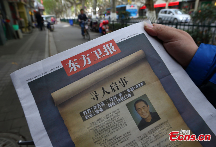 Photo taken on Nov 26, 2013 shows the front page of the Nanjing-based newspaper Oriental Guardia. The front-page headline called out Chinese movie director Zhang Yimou amid widespread rumors that he has breached the one-child policy. [Photo: China News Service / Yang Bo]