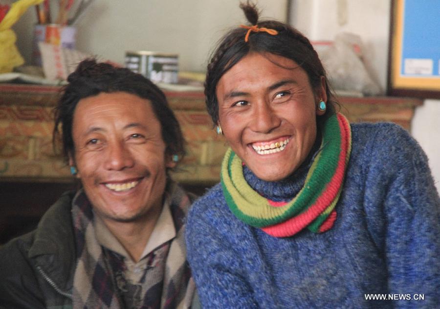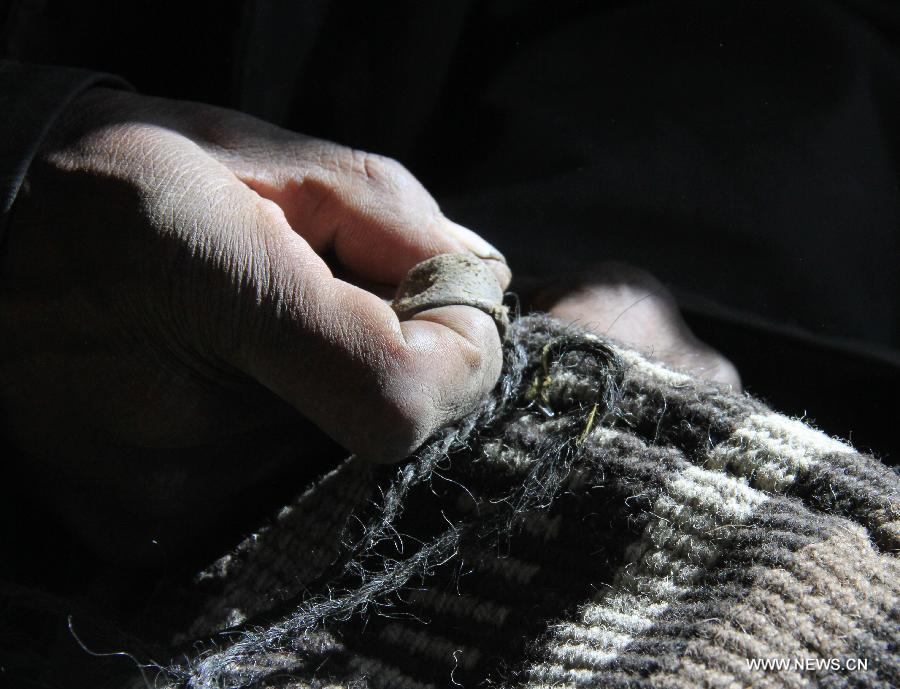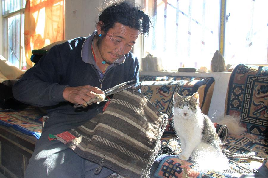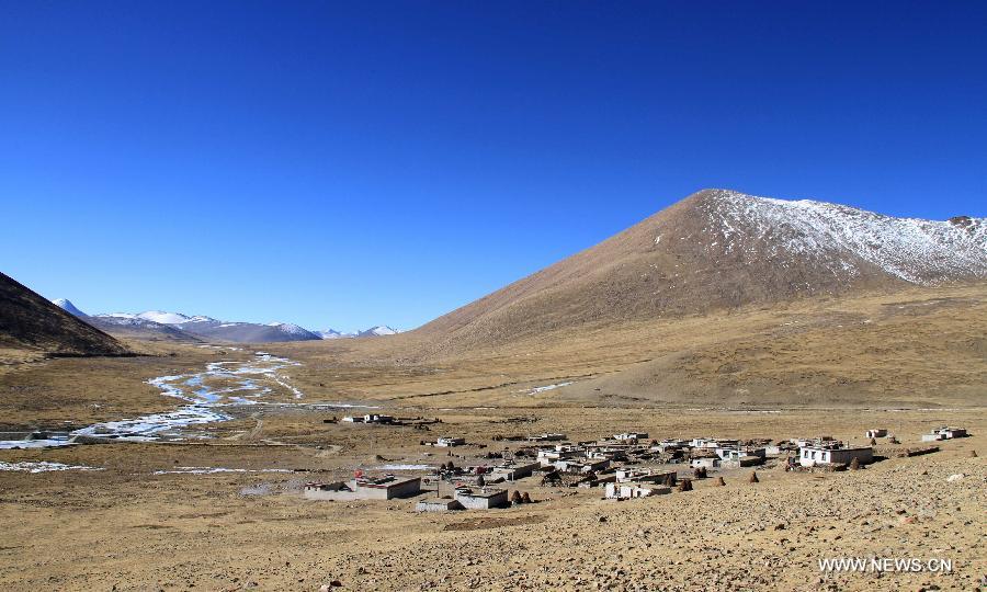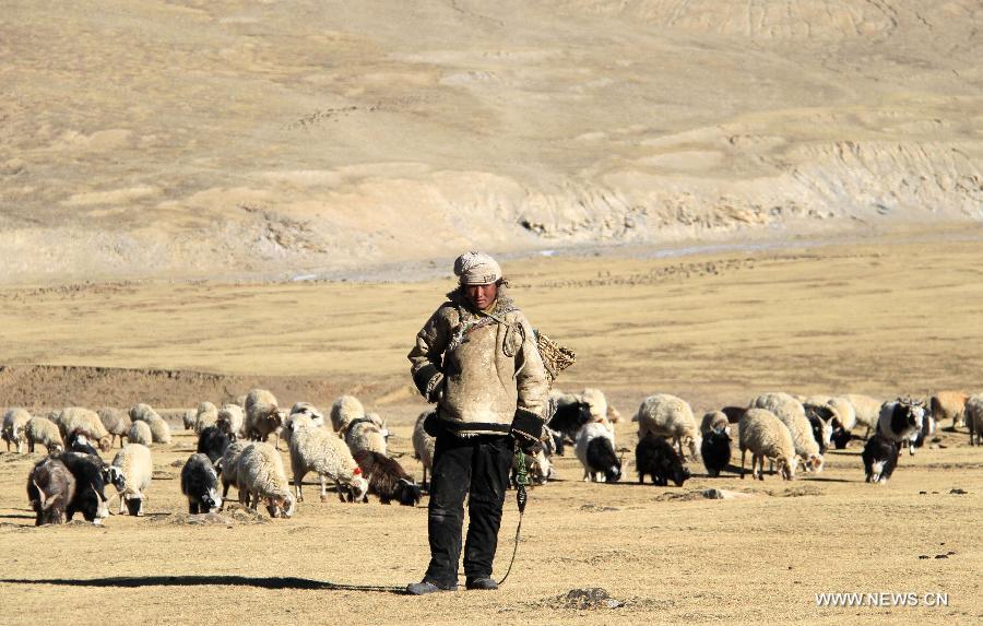 A herdsman grazes the sheep on a grassland near the Dejiu village in southwest China's Tibet Autonomous Region, Nov. 13, 2013. Located more than 600 kilometers away from Lhasa, capital of Tibet, Dejiu Village faces the Mount Qomolangma in its southeast. With an altitude of 4,972 meters, the village seldom see green trees around the year. There are now 20 families and 118 villagers living in the village, where agriculture can hardly develop and people live on livestock (namely yak and sheep) raising for many generations. With the help of the government, the village has taken on a new look in recent years, with the living standards of the villagers rising obviously. However, to add the income of its villagers is still a problem facing Dejiu. (Xinhua/Wang Yunjia)