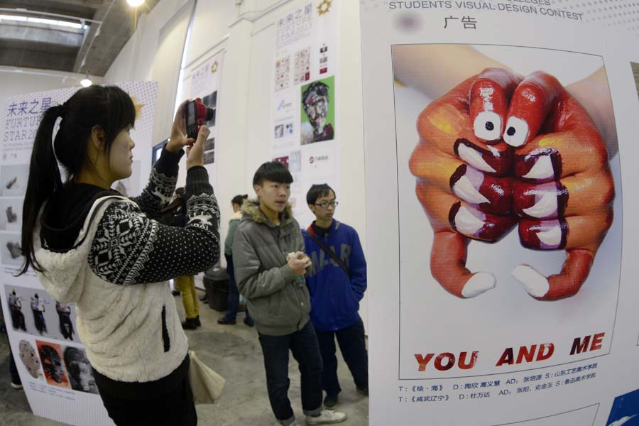 Visitors enjoy the top prize-winning work Werkschau 2013 from the Sixth China International Poster Biennial, in Hangzhou, Zhejiang province, Nov 28, 2013. [Photo/Xinhua]