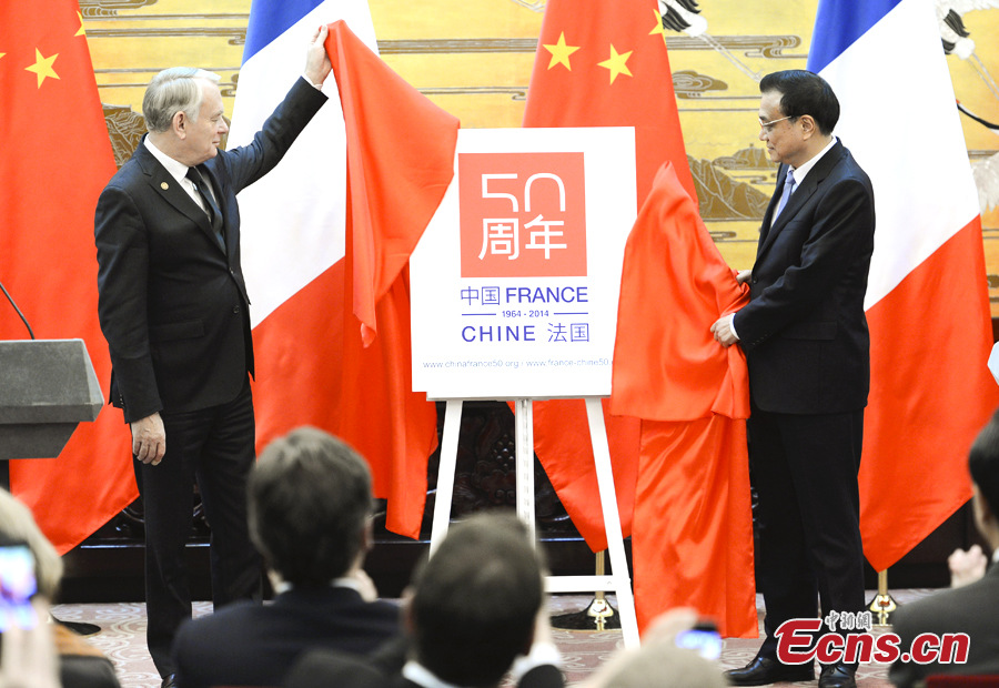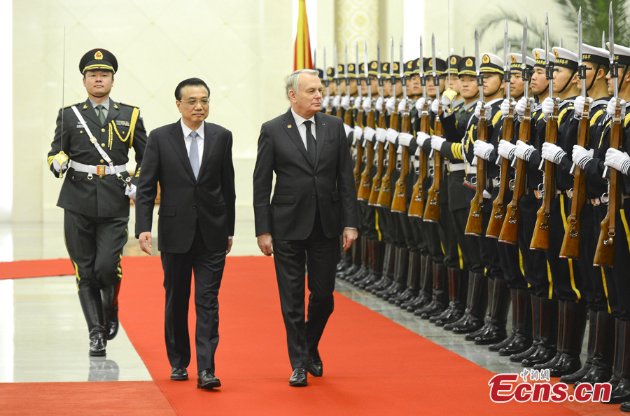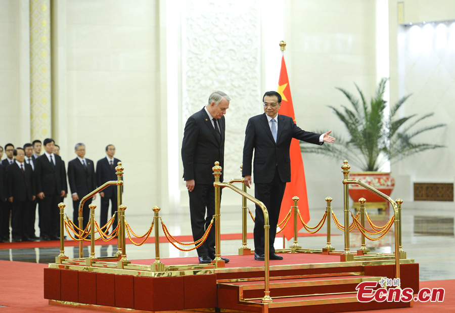 Chinese Premier Li Keqiang welcomes French Prime Minister Jean-Marc Ayrault (L) during a ceremony held at the Great Hall of the People in Beijing, Dec 6, 2013. (Photo: China News Service / Liu Zhen)