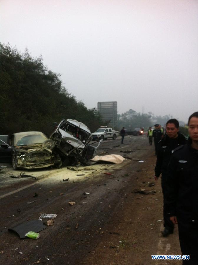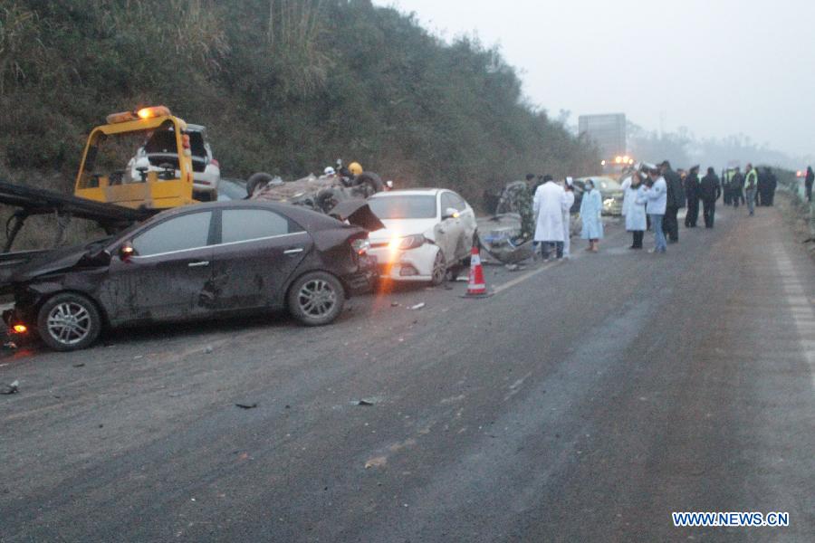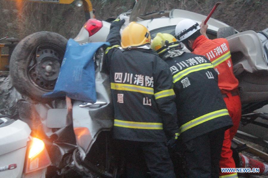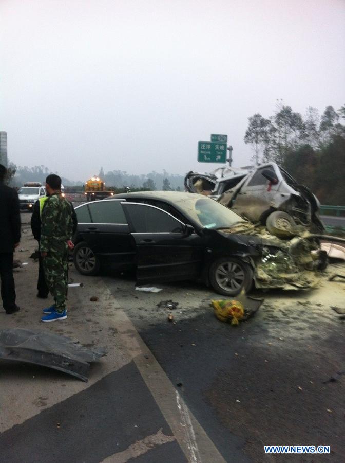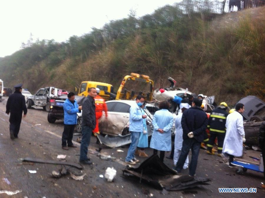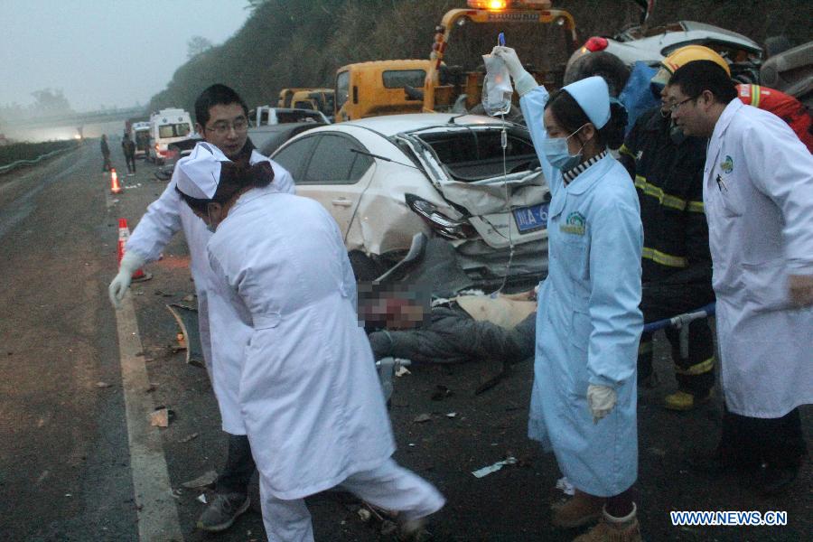Medical workers help an injured man at the scene of a highway pile-up in southwest China's Sichuan Province, Dec. 8, 2013. A sedan's overturn caused traffic jam on the Chengzilu Highway, and a heavy truck suddenly dashed to vehicles queuing in front, causing a 19-car pile-up around 4:00 p.m Sunday. The accident has killed eight people and injured 23. (Xinhua)